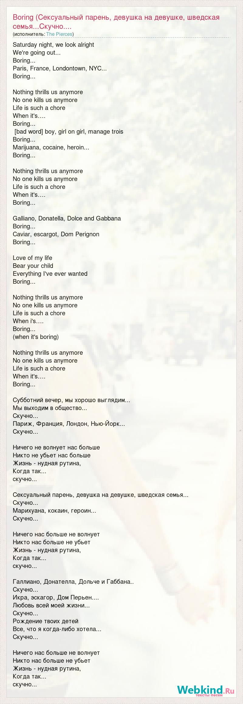 Saturday night, we look alright We're going out... Boring... Paris, France, Londontown, NYC... Boring... Nothing thrills us anymore No one kills us anymore Life is such a chore When it's…. Boring... [bad word] boy, girl on girl, manage trois Boring... Marijuana, cocaine, heroin... Boring... Nothing thrills us anymore No one kills us anymore Life is such a chore When it's…. Boring... Galliano, Donatella, Dolce and Gabbana Boring... Caviar, escargot, Dom Perignon Boring... Love of my life Bear your child Everything I've ever wanted Boring... Nothing thrills us anymore No one kills us anymore Life is such a chore When i's…. Boring... (when it's boring) Nothing thrills us anymore No one kills us anymore Life is such a chore When it's…. Boring... Субботний вечер, мы хорошо выглядим... Мы выходим в общество... Скучно... Париж, Франция, Лондон, Нью-Йорк... Скучно... Ничего не волнует нас больше Никто не убьет нас больше Жизнь - нудная рутина, Когда так... скучно... Сексуальный парень, девушка на девушке, шведская семья... Скучно... Марихуана, кокаин, героин... Скучно... Ничего нас больше не волнует Никто нас больше не убьет Жизнь - нудная рутина, Когда так... скучно... Галлиано, Донателла, Дольче и Габбана.. Скучно... Икра, эскагор, Дом Перьен.... Любовь всей моей жизни... Скучно... Рождение твоих детей Все, что я когда-либо хотела... Скучно... Ничего нас больше не волнует Никто нас больше не убьет Жизнь - нудная рутина, Когда так... скучно...