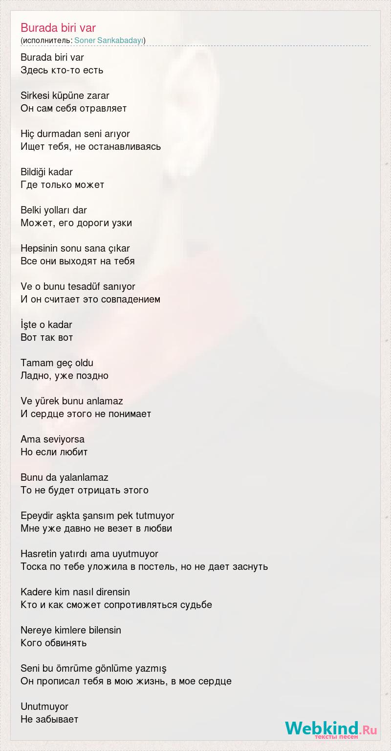 Burada biri var Здесь кто-то есть Sirkesi küpüne zarar Он сам себя отравляет Hiç durmadan seni arıyor Ищет тебя, не останавливаясь Bildiği kadar Где только может Belki yolları dar Может, его дороги узки Hepsinin sonu sana çıkar Все они выходят на тебя Ve o bunu tesadüf sanıyor И он считает это совпадением İşte o kadar Вот так вот Tamam geç oldu Ладно, уже поздно Ve yürek bunu anlamaz И сердце этого не понимает Ama seviyorsa Но если любит Bunu da yalanlamaz То не будет отрицать этого Epeydir aşkta şansım pek tutmuyor Мне уже давно не везет в любви Нasretin yatırdı ama uyutmuyor Тоска по тебе уложила в постель, но не дает заснуть Kadere kim nasıl dirensin Кто и как сможет сопротивляться судьбе Nereye kimlere bilensin Кого обвинять Seni bu ömrüme gönlüme yazmış Он прописал тебя в мою жизнь, в мое сердце Unutmuyor Не забывает