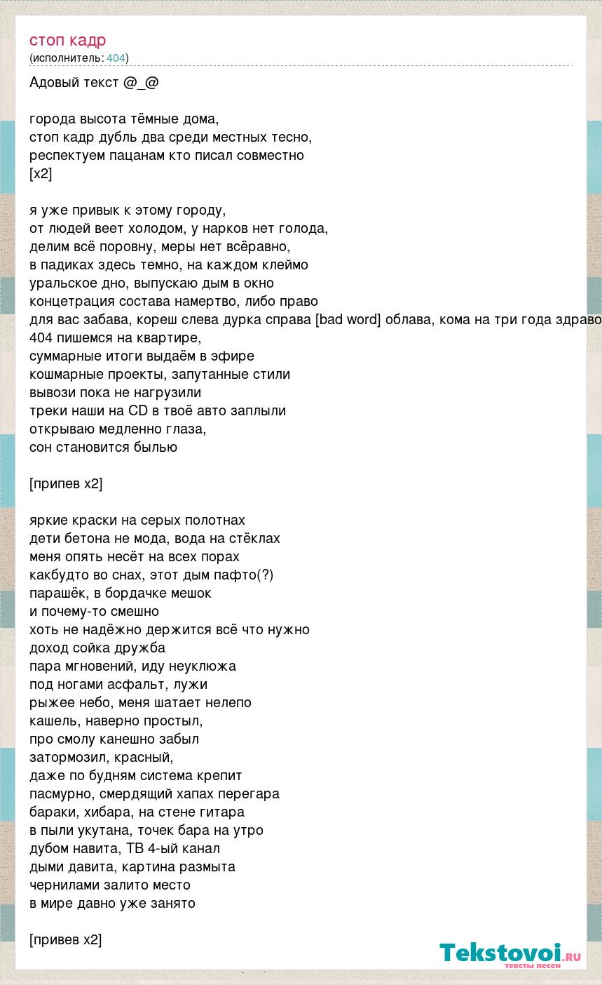 Адовый текст @_@ города высота тёмные дома, стоп кадр дубль два среди местных тесно, респектуем пацанам кто писал совместно [x2] я уже привык к этому городу, от людей веет холодом, у нарков нет голода, делим всё поровну, меры нет всёравно, в падиках здесь темно, на каждом клеймо уральское дно, выпускаю дым в окно концетрация состава намертво, либо право для вас забава, кореш слева дурка справа [bad word] облава, кома на три года здраво 404 пишемся на квартире, суммарные итоги выдаём в эфире кошмарные проекты, запутанные стили вывози пока не нагрузили треки наши на CD в твоё авто заплыли открываю медленно глаза, сон становится былью [припев x2] яркие краски на серых полотнах дети бетона не мода, вода на стёклах меня опять несёт на всех порах какбудто во снах, этот дым пафто(?) парашёк, в бордачке мешок и почему-то смешно хоть не надёжно держится всё что нужно доход сойка дружба пара мгновений, иду неуклюжа под ногами асфальт, лужи рыжее небо, меня шатает нелепо кашель, наверно простыл, про смолу канешно забыл затормозил, красный, даже по будням система крепит пасмурно, смердящий хапах перегара бараки, хибара, на стене гитара в пыли укутана, точек бара на утро дубом навита, ТВ 4-ый канал дыми давита, картина размыта чернилами залито место в мире давно уже занято [привев x2]