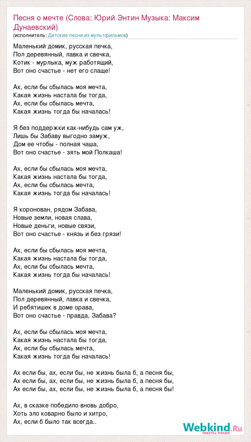 Маленький домик, русская печка, Пол деревянный, лавка и свечка, Котик - мурлыка, муж работящий, Вот оно счастье - нет его слаще! Ах, если бы сбылась моя мечта, Какая жизнь настала бы тогда, Ах, если бы сбылась мечта, Какая жизнь тогда бы началась! Я без поддержки как-нибудь сам уж, Лишь бы Забаву выгодно замуж, Дом ее чтобы - полная чаша, Вот оно счастье - зять мой Полкаша! Ах, если бы сбылась моя мечта, Какая жизнь настала бы тогда, Ах, если бы сбылась мечта, Какая жизнь тогда бы началась! Я коронован, рядом Забава, Новые земли, новая слава, Новые деньги, новые связи, Вот оно счастье - князь и без грязи! Ах, если бы сбылась моя мечта, Какая жизнь настала бы тогда, Ах, если бы сбылась мечта, Какая жизнь тогда бы началась! Маленький домик, русская печка, Пол деревянный, лавка и свечка, И ребятишек в доме орава, Вот оно счастье - правда, Забава? Ах, если бы сбылась моя мечта, Какая жизнь настала бы тогда, Ах, если бы сбылась мечта, Какая жизнь тогда бы началась! Ах если бы, ах, если бы, не жизнь была б, а песня бы, Ах если бы, ах, если бы, не жизнь была б, а песня бы, Ах если бы, ах, если бы, не жизнь была б, а песня бы! Ах, в сказке победило вновь добро, Хоть зло коварно было и хитро, Ах, если б было так всегда..
