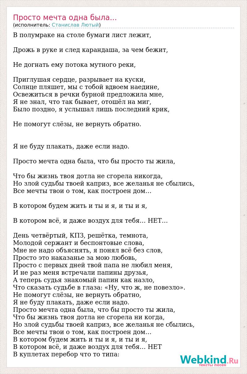 В полумраке на столе бумаги лист лежит, Дрожь в руке и след карандаша, за чем бежит, Не догнать ему потока мутного реки, Приглушая сердце, разрывает на куски, Солнце пляшет, мы с тобой вдвоем наедине, Освежиться в речки бурной предложила мне, Я не знал, что так бывает, отошёл на миг, Было поздно, я услышал лишь последний крик, Не помогут слёзы, не вернуть обратно. Я не буду плакать, даже если надо. Просто мечта одна была, что бы просто ты жила, Что бы жизнь твоя дотла не сгорела никогда, Но злой судьбы твоей каприз, все желанья не сбылись, Все мечты твои о том, как построен дом… В котором будем жить и ты и я, и ты и я, В котором всё, и даже воздух для тебя… НЕТ… День четвёртый, КПЗ, решётка, темнота, Молодой сержант и беспонтовые слова, Мне не надо объяснять, я понял всё без слов, Просто это наказанье за мою любовь, Просто с первых дней твой папа не любил меня, И не раз меня встречали папины друзья, А теперь судья знакомый папин как назло, Что сказать судьбе в глаза: «Ну, что ж, не повезло». Не помогут слёзы, не вернуть обратно, Я не буду плакать, даже если надо. Просто мечта одна была, что бы просто ты жила, Что бы жизнь твоя дотла не сгорела ни когда, Но злой судьбы твоей каприз, все желанья не сбылись, Все мечты твои о том, как построен дом… В котором будем жить и ты и я, и ты и я, В котором всё, и даже воздух для тебя… НЕТ В куплетах перебор что то типа: