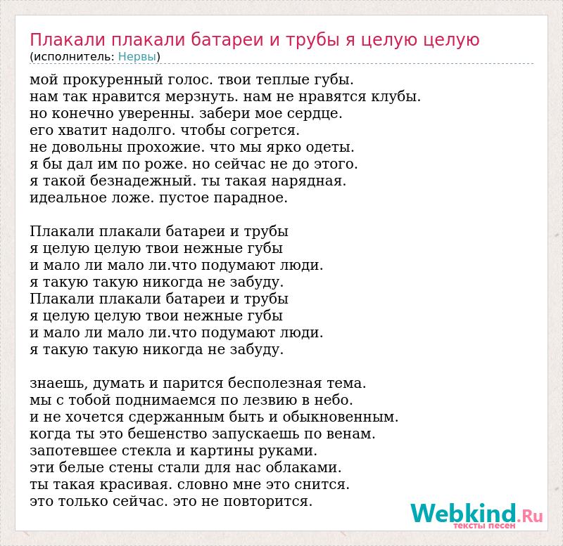 мой прокуренный голос. твои теплые губы. нам так нравится мерзнуть. нам не нравятся клубы. но конечно уверенны. забери мое сердце. его хватит надолго. чтобы согрется. не довольны прохожие. что мы ярко одеты. я бы дал им по роже. но сейчас не до этого. я такой безнадежный. ты такая нарядная. идеальное ложе. пустое парадное. Плакали плакали батареи и трубы я целую целую твои нежные губы и мало ли мало ли.что подумают люди. я такую такую никогда не забуду. Плакали плакали батареи и трубы я целую целую твои нежные губы и мало ли мало ли.что подумают люди. я такую такую никогда не забуду. знаешь, думать и парится бесполезная тема. мы с тобой поднимаемся по лезвию в небо. и не хочется сдержанным быть и обыкновенным. когда ты это бешенство запускаешь по венам. запотевшее стекла и картины руками. эти белые стены стали для нас облаками. ты такая красивая. словно мне это снится. это только сейчас. это не повторится.