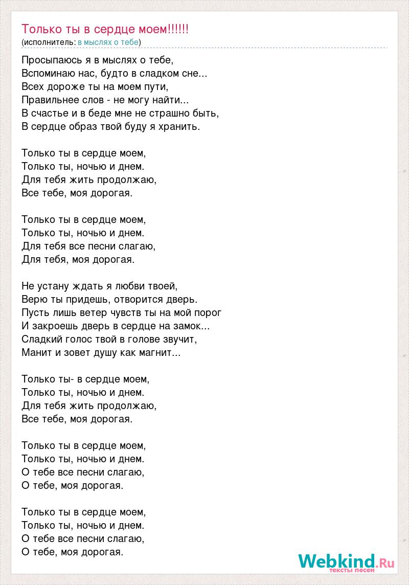 Просыпаюсь я в мыслях о тебе, Вспоминаю нас, будто в сладком сне... Всех дороже ты на моем пути, Правильнее слов - не могу найти... В счастье и в беде мне не страшно быть, В сердце образ твой буду я хранить. Только ты в сердце моем, Только ты, ночью и днем. Для тебя жить продолжаю, Все тебе, моя дорогая. Только ты в сердце моем, Только ты, ночью и днем. Для тебя все песни слагаю, Для тебя, моя дорогая. Не устану ждать я любви твоей, Верю ты придешь, отворится дверь. Пусть лишь ветер чувств ты на мой порог И закроешь дверь в сердце на замок... Сладкий голос твой в голове звучит, Манит и зовет душу как магнит... Только ты- в сердце моем, Только ты, ночью и днем. Для тебя жить продолжаю, Все тебе, моя дорогая. Только ты в сердце моем, Только ты, ночью и днем. О тебе все песни слагаю, О тебе, моя дорогая. Только ты в сердце моем, Только ты, ночью и днем. О тебе все песни слагаю, О тебе, моя дорогая.