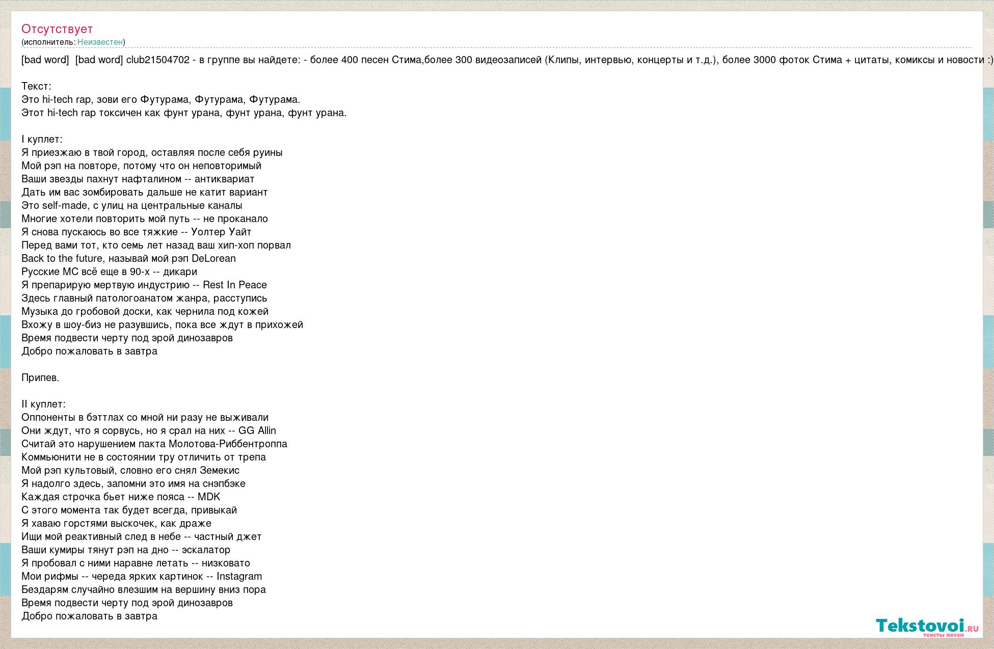 [bad word] [bad word] club21504702 - в группе вы найдете: - более 400 песен Стима,более 300 видеозаписей (Клипы, интервью, концерты и т.д.), более 3000 фоток Стима + цитаты, комиксы и новости :) Текст: Это hi-tech rap, зови его Футурама, Футурама, Футурама. Этот hi-tech rap токсичен как фунт урана, фунт урана, фунт урана. I куплет: Я приезжаю в твой город, оставляя после себя руины Мой рэп на повторе, потому что он неповторимый Ваши звезды пахнут нафталином -- антиквариат Дать им вас зомбировать дальше не катит вариант Это self-made, с улиц на центральные каналы Многие хотели повторить мой путь -- не проканало Я снова пускаюсь во все тяжкие -- Уолтер Уайт Перед вами тот, кто семь лет назад ваш хип-хоп порвал Back to the future, называй мой рэп DeLorean Русские MC всё еще в 90-х -- дикари Я препарирую мертвую индустрию -- Rest In Peace Здесь главный патологоанатом жанра, расступись Музыка до гробовой доски, как чернила под кожей Вхожу в шоу-биз не разувшись, пока все ждут в прихожей Время подвести черту под эрой динозавров Добро пожаловать в завтра Припев. II куплет: Оппоненты в бэттлах со мной ни разу не выживали Они ждут, что я сорвусь, но я срал на них -- GG Allin Считай это нарушением пакта Молотова-Риббентроппа Коммьюнити не в состоянии тру отличить от трепа Мой рэп культовый, словно его снял Земекис Я надолго здесь, запомни это имя на снэпбэке Каждая строчка бьет ниже пояса -- MDK С этого момента так будет всегда, привыкай Я хаваю горстями выскочек, как драже Ищи мой реактивный след в небе -- частный джет Ваши кумиры тянут рэп на дно -- эскалатор Я пробовал с ними наравне летать -- низковато Мои рифмы -- череда ярких картинок -- Instagram Бездарям случайно влезшим на вершину вниз пора Время подвести черту под эрой динозавров Добро пожаловать в завтра