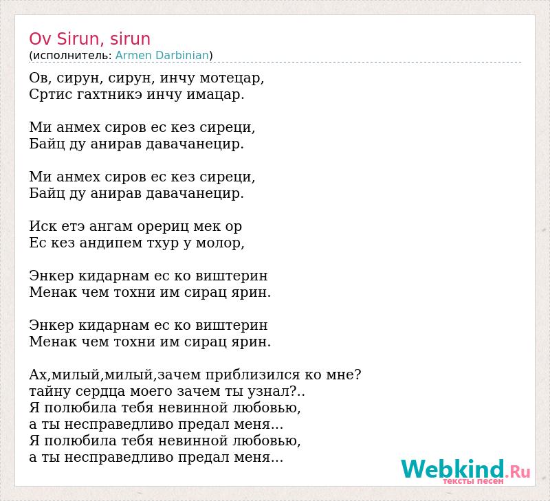 Ов, сирун, сирун, инчу мотецар, Сртис гахтникэ инчу имацар. Ми анмех сиров ес кез сиреци, Байц ду анирав давачанецир. Ми анмех сиров ес кез сиреци, Байц ду анирав давачанецир. Иск етэ ангам орериц мек ор Ес кез андипем тхур у молор, Энкер кидарнам ес ко виштерин Менак чем тохни им сирац ярин. Энкер кидарнам ес ко виштерин Менак чем тохни им сирац ярин. Ах,милый,милый,зачем приблизился ко мне? тайну сердца моего зачем ты узнал?.. Я полюбила тебя невинной любовью, а ты несправедливо предал меня... Я полюбила тебя невинной любовью, а ты несправедливо предал меня...