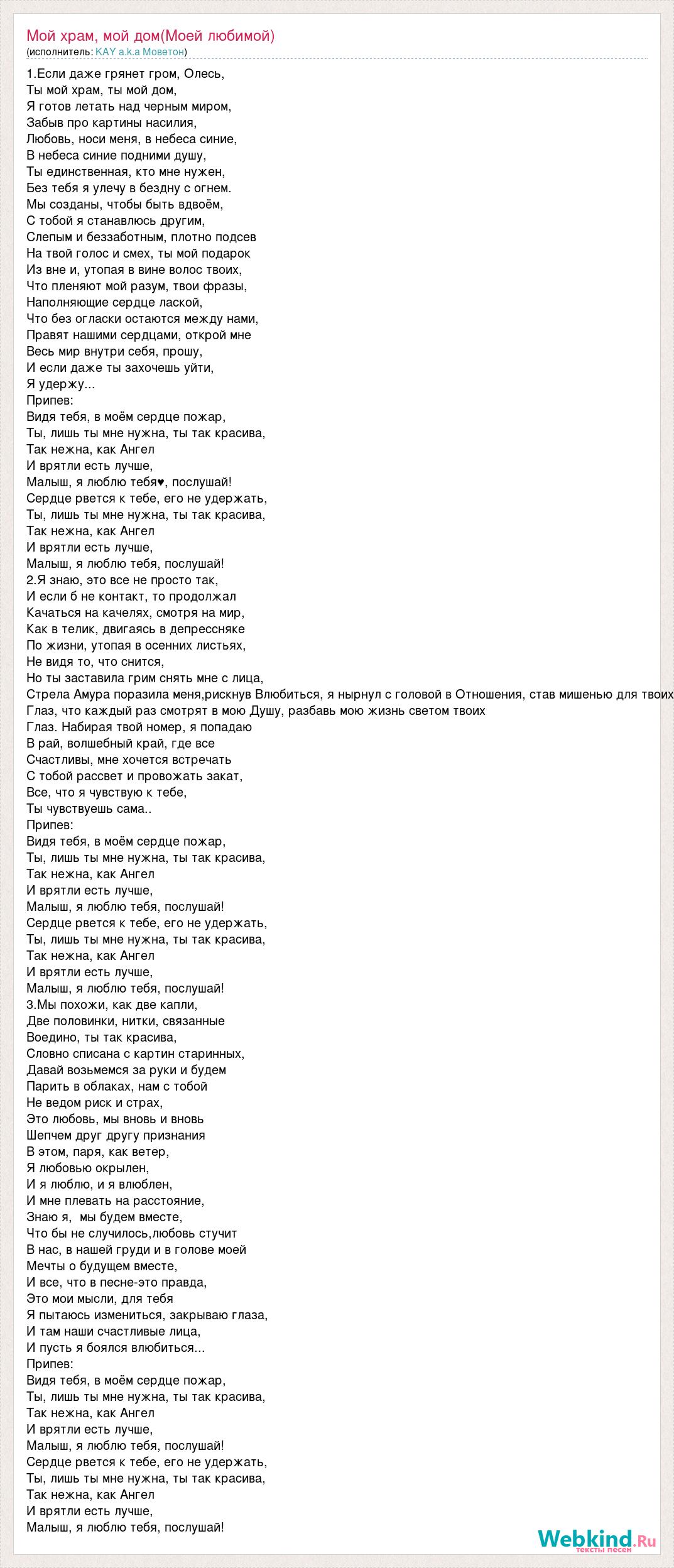 1.Если даже грянет гром, Олесь, Ты мой храм, ты мой дом, Я готов летать над черным миром, Забыв про картины насилия, Любовь, носи меня, в небеса синие, В небеса синие подними душу, Ты единственная, кто мне нужен, Без тебя я улечу в бездну с огнем. Мы созданы, чтобы быть вдвоём, С тобой я станавлюсь другим, Слепым и беззаботным, плотно подсев На твой голос и смех, ты мой подарок Из вне и, утопая в вине волос твоих, Что пленяют мой разум, твои фразы, Наполняющие сердце лаской, Что без огласки остаются между нами, Правят нашими сердцами, открой мне Весь мир внутри себя, прошу, И если даже ты захочешь уйти, Я удержу... Припев: Видя тебя, в моём сердце пожар, Ты, лишь ты мне нужна, ты так красива, Так нежна, как Ангел И врятли есть лучше, Малыш, я люблю тебя♥, послушай! Сердце рвется к тебе, его не удержать, Ты, лишь ты мне нужна, ты так красива, Так нежна, как Ангел И врятли есть лучше, Малыш, я люблю тебя, послушай! 2.Я знаю, это все не просто так, И если б не контакт, то продолжал Качаться на качелях, смотря на мир, Как в телик, двигаясь в депрессняке По жизни, утопая в осенних листьях, Не видя то, что снится, Но ты заставила грим снять мне с лица, Стрела Амура поразила меня,рискнув Влюбиться, я нырнул с головой в Отношения, став мишенью для твоих Глаз, что каждый раз смотрят в мою Душу, разбавь мою жизнь светом твоих Глаз. Набирая твой номер, я попадаю В рай, волшебный край, где все Счастливы, мне хочется встречать С тобой рассвет и провожать закат, Все, что я чувствую к тебе, Ты чувствуешь сама.. Припев: Видя тебя, в моём сердце пожар, Ты, лишь ты мне нужна, ты так красива, Так нежна, как Ангел И врятли есть лучше, Малыш, я люблю тебя, послушай! Сердце рвется к тебе, его не удержать, Ты, лишь ты мне нужна, ты так красива, Так нежна, как Ангел И врятли есть лучше, Малыш, я люблю тебя, послушай! 3.Мы похожи, как две капли, Две половинки, нитки, связанные Воедино, ты так красива, Словно списана с картин старинных, Давай возьмемся за руки и будем Парить в облаках, нам с тобой Не ведом риск и страх, Это любовь, мы вновь и вновь Шепчем друг другу признания В этом, паря, как ветер, Я любовью окрылен, И я люблю, и я влюблен, И мне плевать на расстояние, Знаю я, мы будем вместе, Что бы не случилось,любовь стучит В нас, в нашей груди и в голове моей Мечты о будущем вместе, И все, что в песне-это правда, Это мои мысли, для тебя Я пытаюсь измениться, закрываю глаза, И там наши счастливые лица, И пусть я боялся влюбиться... Припев: Видя тебя, в моём сердце пожар, Ты, лишь ты мне нужна, ты так красива, Так нежна, как Ангел И врятли есть лучше, Малыш, я люблю тебя, послушай! Сердце рвется к тебе, его не удержать, Ты, лишь ты мне нужна, ты так красива, Так нежна, как Ангел И врятли есть лучше, Малыш, я люблю тебя, послушай!