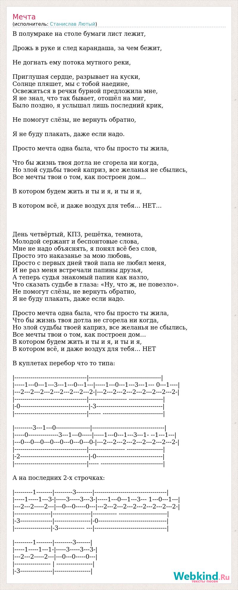 В полумраке на столе бумаги лист лежит, Дрожь в руке и след карандаша, за чем бежит, Не догнать ему потока мутного реки, Приглушая сердце, разрывает на куски, Солнце пляшет, мы с тобой наедине, Освежиться в речки бурной предложила мне, Я не знал, что так бывает, отошёл на миг, Было поздно, я услышал лишь последний крик, Не помогут слёзы, не вернуть обратно, Я не буду плакать, даже если надо. Просто мечта одна была, что бы просто ты жила, Что бы жизнь твоя дотла не сгорела ни когда, Но злой судьбы твоей каприз, все желанья не сбылись, Все мечты твои о том, как построен дом… В котором будем жить и ты и я, и ты и я, В котором всё, и даже воздух для тебя… НЕТ… День четвёртый, КПЗ, решётка, темнота, Молодой сержант и беспонтовые слова, Мне не надо объяснять, я понял всё без слов, Просто это наказанье за мою любовь, Просто с первых дней твой папа не любил меня, И не раз меня встречали папины друзья, А теперь судья знакомый папин как назло, Что сказать судьбе в глаза: «Ну, что ж, не повезло». Не помогут слёзы, не вернуть обратно, Я не буду плакать, даже если надо. Просто мечта одна была, что бы просто ты жила, Что бы жизнь твоя дотла не сгорела ни когда, Но злой судьбы твоей каприз, все желанья не сбылись, Все мечты твои о том, как построен дом… В котором будем жить и ты и я, и ты и я, В котором всё, и даже воздух для тебя… НЕТ В куплетах перебор что то типа: |------------------------------------|------------------------------------| |-----1---0---1---3---1---0---1---|-----1---0---1---3---1--- 0---1----| |---2---2---2---2---2---2---2---2-|---2---2---2---2---2---2---2---2-| |------------------------------------|------------------- -----------------| |-0----------------------------------|-3---------------------------------| |------------------------------------|------ ------------------------------| |---------3---1---0-----------------|------------------------------------| |-----0---------------3---1---0-----|-----1---0---1---3---1- --1---1---| |---0---0---0---0---0---0---0---0-|---2---2---2---2---2---2---2---2-| |------------------------------------|------------------ ------------------| |-2----------------------------------|-0---------------------------------| |------------------------------------|----- -------------------------------| А на последних 2-х строчках: |---------1--------|---------3--------|------------------------------------| |-----1-----1---3-|-----3-----3---3-|-----1---0---1---3--- 1---0---1---| |---2---2-----2---|---0---0-----0---|---2---2---2---2---2---2---2---2-| |------------------|-------------------|------------ ------------------------| |-3----------------|------------------|-0----------------------------------| |------------------|-3------------- ---|------------------------------------| |---------1--------|---------3-------| |-----1-----1---1-|-----3-----3---3-| |---2---2-----2---|---0---0-----0---| |------------------ | ------------------| |-3----------------|------------------|