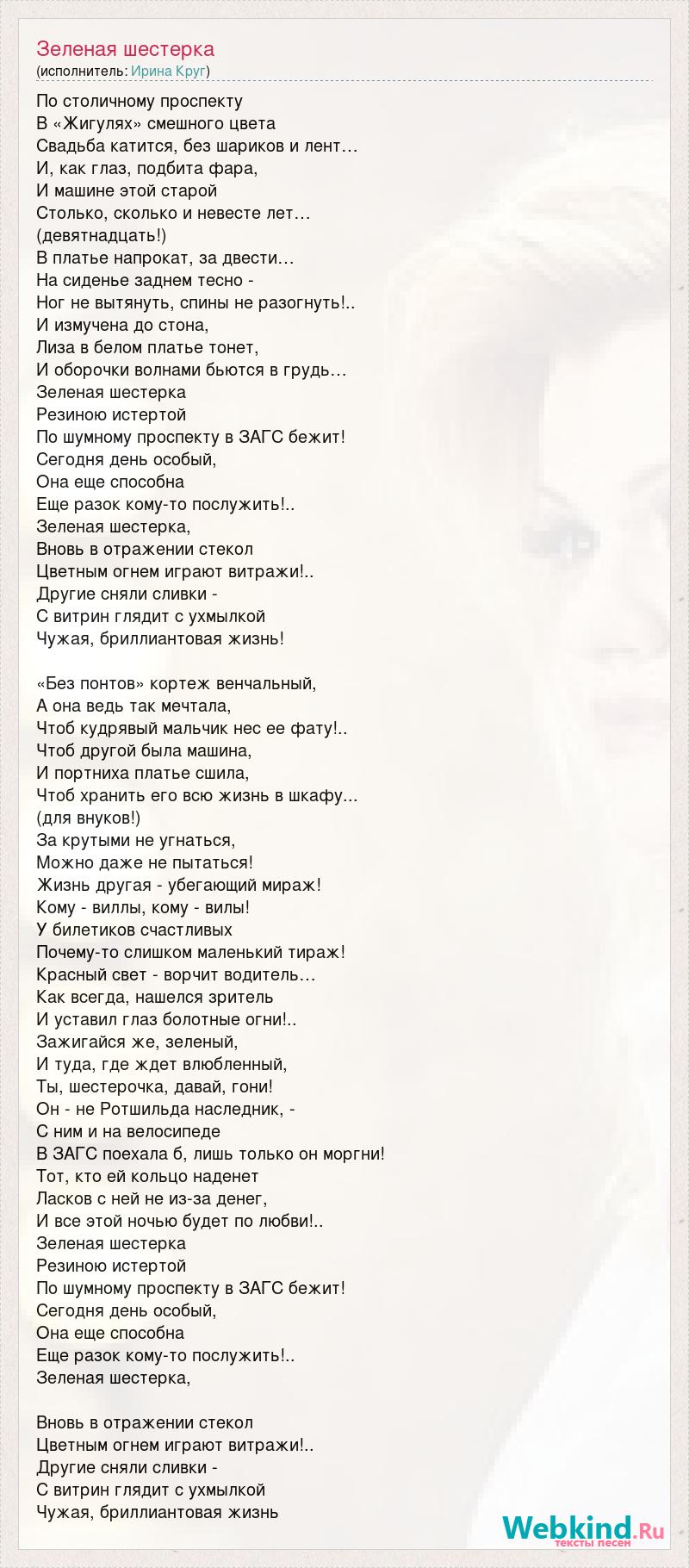 По столичному проспекту В «Жигулях» смешного цвета Свадьба катится, без шариков и лент… И, как глаз, подбита фара, И машине этой старой Cтолько, сколько и невесте лет… (девятнадцать!) В платье напрокат, за двести… На сиденье заднем тесно - Ног не вытянуть, спины не разогнуть!.. И измучена до стона, Лиза в белом платье тонет, И оборочки волнами бьются в грудь… Зеленая шестерка Резиною истертой По шумному проспекту в ЗАГС бежит! Сегодня день особый, Она еще способна Еще разок кому-то послужить!.. Зеленая шестерка, Вновь в отражении стекол Цветным огнем играют витражи!.. Другие сняли сливки - С витрин глядит с ухмылкой Чужая, бриллиантовая жизнь! «Без понтов» кортеж венчальный, А она ведь так мечтала, Чтоб кудрявый мальчик нес ее фату!.. Чтоб другой была машина, И портниха платье сшила, Чтоб хранить его всю жизнь в шкафу... (для внуков!) За крутыми не угнаться, Можно даже не пытаться! Жизнь другая - убегающий мираж! Кому - виллы, кому - вилы! У билетиков счастливых Почему-то слишком маленький тираж! Красный свет - ворчит водитель… Как всегда, нашелся зритель И уставил глаз болотные огни!.. Зажигайся же, зеленый, И туда, где ждет влюбленный, Ты, шестерочка, давай, гони! Он - не Ротшильда наследник, - С ним и на велосипеде В ЗАГС поехала б, лишь только он моргни! Тот, кто ей кольцо наденет Ласков с ней не из-за денег, И все этой ночью будет по любви!.. Зеленая шестерка Резиною истертой По шумному проспекту в ЗАГС бежит! Сегодня день особый, Она еще способна Еще разок кому-то послужить!.. Зеленая шестерка, Вновь в отражении стекол Цветным огнем играют витражи!.. Другие сняли сливки - С витрин глядит с ухмылкой Чужая, бриллиантовая жизнь