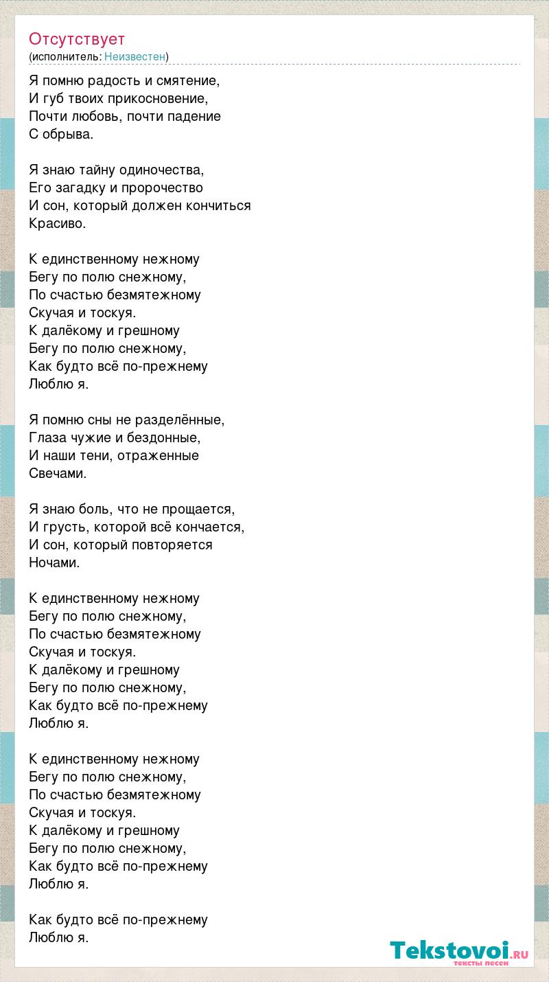 Я помню радость и смятение, И губ твоих прикосновение, Почти любовь, почти падение С обрыва. Я знаю тайну одиночества, Его загадку и пророчество И сон, который должен кончиться Красиво. К единственному нежному Бегу по полю снежному, По счастью безмятежному Скучая и тоскуя. К далёкому и грешному Бегу по полю снежному, Как будто всё по-прежнему Люблю я. Я помню сны не разделённые, Глаза чужие и бездонные, И наши тени, отраженные Свечами. Я знаю боль, что не прощается, И грусть, которой всё кончается, И сон, который повторяется Ночами. К единственному нежному Бегу по полю снежному, По счастью безмятежному Скучая и тоскуя. К далёкому и грешному Бегу по полю снежному, Как будто всё по-прежнему Люблю я. К единственному нежному Бегу по полю снежному, По счастью безмятежному Скучая и тоскуя. К далёкому и грешному Бегу по полю снежному, Как будто всё по-прежнему Люблю я. Как будто всё по-прежнему Люблю я.