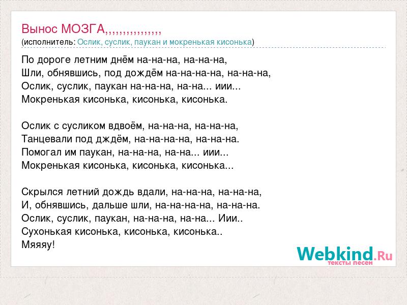 По дороге летним днём на-на-на, на-на-на, Шли, обнявшись, под дождём на-на-на-на, на-на-на, Ослик, суслик, паукан на-на-на, на-на... иии... Мокренькая кисонька, кисонька, кисонька. Ослик с сусликом вдвоём, на-на-на, на-на-на, Танцевали под дждём, на-на-на-на, на-на-на. Помогал им паукан, на-на-на, на-на... иии... Мокренькая кисонька, кисонька, кисонька... Скрылся летний дождь вдали, на-на-на, на-на-на, И, обнявшись, дальше шли, на-на-на-на, на-на-на. Ослик, суслик, паукан, на-на-на, на-на... Иии.. Сухонькая кисонька, кисонька, кисонька.. Мяяяу!