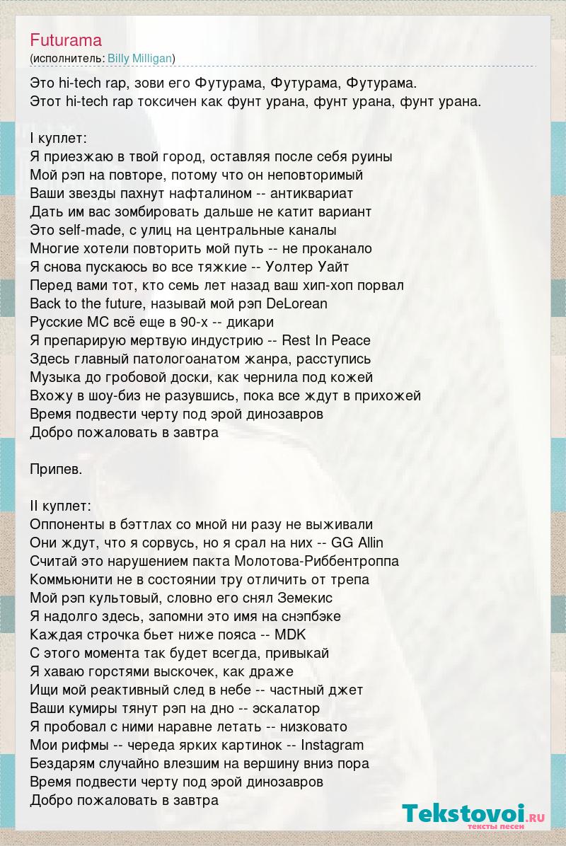 Это hi-tech rap, зови его Футурама, Футурама, Футурама. Этот hi-tech rap токсичен как фунт урана, фунт урана, фунт урана. I куплет: Я приезжаю в твой город, оставляя после себя руины Мой рэп на повторе, потому что он неповторимый Ваши звезды пахнут нафталином -- антиквариат Дать им вас зомбировать дальше не катит вариант Это self-made, с улиц на центральные каналы Многие хотели повторить мой путь -- не проканало Я снова пускаюсь во все тяжкие -- Уолтер Уайт Перед вами тот, кто семь лет назад ваш хип-хоп порвал Back to the future, называй мой рэп DeLorean Русские MC всё еще в 90-х -- дикари Я препарирую мертвую индустрию -- Rest In Peace Здесь главный патологоанатом жанра, расступись Музыка до гробовой доски, как чернила под кожей Вхожу в шоу-биз не разувшись, пока все ждут в прихожей Время подвести черту под эрой динозавров Добро пожаловать в завтра Припев. II куплет: Оппоненты в бэттлах со мной ни разу не выживали Они ждут, что я сорвусь, но я срал на них -- GG Allin Считай это нарушением пакта Молотова-Риббентроппа Коммьюнити не в состоянии тру отличить от трепа Мой рэп культовый, словно его снял Земекис Я надолго здесь, запомни это имя на снэпбэке Каждая строчка бьет ниже пояса -- MDK С этого момента так будет всегда, привыкай Я хаваю горстями выскочек, как драже Ищи мой реактивный след в небе -- частный джет Ваши кумиры тянут рэп на дно -- эскалатор Я пробовал с ними наравне летать -- низковато Мои рифмы -- череда ярких картинок -- Instagram Бездарям случайно влезшим на вершину вниз пора Время подвести черту под эрой динозавров Добро пожаловать в завтра