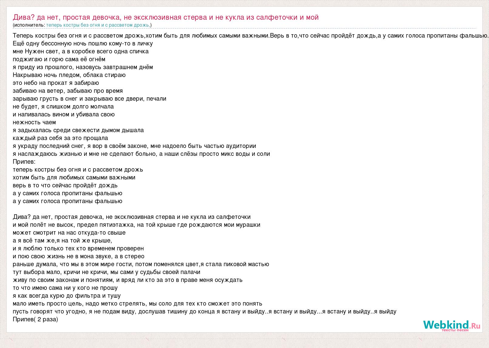 Теперь костры без огня и с рассветом дрожь,хотим быть для любимых самыми важными.Верь в то,что сейчас пройдёт дождь,а у самих голоса пропитаны фальшью. Ещё одну бессонную ночь пошлю кому-то в личку мне Нужен свет, а в коробке всего одна спичка поджигаю и горю сама её огнём я приду из прошлого, назовусь завтрашнем днём Накрываю ночь пледом, облака стираю это небо на прокат я забираю забиваю на ветер, забываю про время зарываю грусть в снег и закрываю все двери, печали не будет, я слишком долго молчала и напивалась вином и убивала свою нежность чаем я задыхалась среди свежести дымом дышала каждый раз себя за это прощала я украду последний снег, я вор в своём законе, мне надоело быть частью аудитории я наслаждаюсь жизнью и мне не сделают больно, а наши слёзы просто микс воды и соли Припев: теперь костры без огня и с рассветом дрожь хотим быть для любимых самыми важными верь в то что сейчас пройдёт дождь а у самих голоса пропитаны фальшью а у самих голоса пропитаны фальшью Дива? да нет, простая девочка, не эксклюзивная стерва и не кукла из салфеточки и мой полёт не высок, предел пятиэтажка, на той крыше где рождаются мои мурашки может смотрит на нас откуда-то свыше а я всё там же,я на той же крыше, и я люблю только тех кто временем проверен и пою свою жизнь не в мона звуке, а в стерео раньше думала, что мы в этом мире гости, потом поменялся цвет,я стала пиковой мастью тут выбора мало, кричи не кричи, мы сами у судьбы своей палачи живу по своим законам и понятиям, и вряд ли кто за это в праве меня осуждать то что имею сама ни у кого не прошу я как всегда курю до фильтра и тушу мало иметь просто цель, надо метко стрелять, мы соло для тех кто сможет это понять пусть говорят что угодно, я не подам виду, дослушав тишину до конца я встану и выйду..я встану и выйду...я встану и выйду..я выйду Припев( 2 раза)