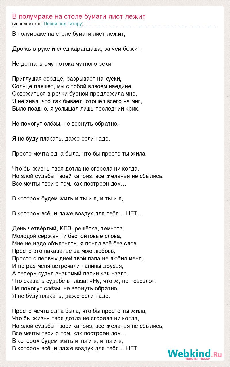 В полумраке на столе бумаги лист лежит, Дрожь в руке и след карандаша, за чем бежит, Не догнать ему потока мутного реки, Приглушая сердце, разрывает на куски, Солнце пляшет, мы с тобой вдвоём наедине, Освежиться в речки бурной предложила мне, Я не знал, что так бывает, отошёл всего на миг, Было поздно, я услышал лишь последний крик, Не помогут слёзы, не вернуть обратно, Я не буду плакать, даже если надо. Просто мечта одна была, что бы просто ты жила, Что бы жизнь твоя дотла не сгорела ни когда, Но злой судьбы твоей каприз, все желанья не сбылись, Все мечты твои о том, как построен дом… В котором будем жить и ты и я, и ты и я, В котором всё, и даже воздух для тебя… НЕТ… День четвёртый, КПЗ, решётка, темнота, Молодой сержант и беспонтовые слова, Мне не надо объяснять, я понял всё без слов, Просто это наказанье за мою любовь, Просто с первых дней твой папа не любил меня, И не раз меня встречали папины друзья, А теперь судья знакомый папин как назло, Что сказать судьбе в глаза: «Ну, что ж, не повезло». Не помогут слёзы, не вернуть обратно, Я не буду плакать, даже если надо. Просто мечта одна была, что бы просто ты жила, Что бы жизнь твоя дотла не сгорела ни когда, Но злой судьбы твоей каприз, все желанья не сбылись, Все мечты твои о том, как построен дом… В котором будем жить и ты и я, и ты и я, В котором всё, и даже воздух для тебя… НЕТ