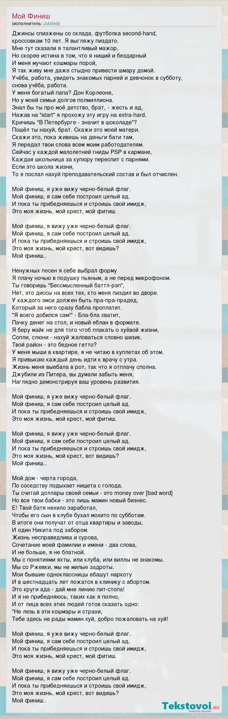 Джинсы спизжены со склада, футболка second-hand, кроссовкам 10 лет. Я выгляжу пиздато. Мне тут сказали я талантливый мажор, Но скорее истина в том, что я нищий и бездарный И меня мучают кошмары порой, Я так живу мне даже стыдно привести шмару домой. Учёба, работа, увидеть знакомых парней и девчонок в субботу, снова учёба, работа. У меня богатый папа? Дон Корлеоне, Но у моей семьи долгов полмиллиона. Знал бы ты про моё детство, брат, - жесть и ад, Нажав на "start" я прохожу эту игру на extra-hard. Кричишь "В Петербурге - значит в шоколаде"? Пошёл ты нахуй, брат. Скажи это моей матери. Скажи это, пока живешь на деньги бати там, Я передал твои слова всем моим работодателям. Сейчас у каждой малолетней гниды PSP в кармане, Каждая школьница за купюру переспит с парнями. Если это школа жизни, То я послал нахуй преподавательский состав и был отчислен. Мой финиш, я уже вижу черно-белый флаг. Мой финиш, я сам себе построил целый ад. И пока ты прибедняешься и строишь свой имидж, Это моя жизнь, мой крест, мой фитиш. Мой финиш, я вижу уже черно-белый флаг. Мой финиш, я сам себе построил целый ад. И пока ты прибедняешься и строишь свой имидж, Это моя жизнь, мой крест, вот видишь? Мой финиш.. Ненужных песен я себе выбрал форму Я плачу ночью в подушку пьяным, а не перед микрофоном. Ты говоришь "Бессмысленный баттл-рэп", Нет, это диссы на всех тех, кто меня пиздил во дворе. У каждого эмси должен быть пра-пра-прадед, Который за него сразу бабла проплатит. "Я всего добился сам!" - Бла-бла хватит, Пачку денег на стол, и новый еблан в формате. Я беру майк не для того чтоб плакать о хуёвой жизни, Сопли, слюни - нахуй жаловаться словно шизик. Твой район - это бедное гетто? У меня мыши в квартире, я не читаю в куплетах об этом. Я привыкаю каждый день идти к врачу с утра. Жизнь меня выебала в рот, так что я отплачу сполна. Джубили из Питера, вы думали забыть меня, Наглядно демонстрируя ваш уровень развития. Мой финиш, я уже вижу черно-белый флаг. Мой финиш, я сам себе построил целый ад. И пока ты прибедняешься и строишь свой имидж, Это моя жизнь, мой крест, мой фитиш. Мой финиш, я вижу уже черно-белый флаг. Мой финиш, я сам себе построил целый ад. И пока ты прибедняешься и строишь свой имидж, Это моя жизнь, мой крест, вот видишь? Мой финиш.. Мой дом - черта города, По соседству подыхает нищета с голода. Ты считай доллары своей семьи - это money over [bad word] Но все твои бабки - это лишь мамин новый бизнес. Е! Твой батя нехило заработал, Чтобы его сын в клубе бухал мохито по субботам. В итоге они получат от отца квартиры и заводы, И один Никита под забором. Жизнь несправедлива и сурова, Сочетание моей фамилии и имени - два слова, И не больше, я не блатной. Мы с понятиями яхты, или клуба, или виллы не знакомы. Мы со Ржевки, мы не милые задроты. Мои бывшие одноклассницы ебашут наркоту И в шестнадцать лет ложатся в клинику с абортом. Это круги ада - дай мне линию пит-стопа! И я не прибедняюсь, таких как я полно, И от лица всех этих людей готов сказать одно: "Не лезь в эти кошмары и страхи, Тебе здесь не рады мамин хуй, добро пожаловать на хуй! Мой финиш, я уже вижу черно-белый флаг. Мой финиш, я сам себе построил целый ад. И пока ты прибедняешься и строишь свой имидж, Это моя жизнь, мой крест, мой фитиш. Мой финиш, я вижу уже черно-белый флаг. Мой финиш, я сам себе построил целый ад. И пока ты прибедняешься и строишь свой имидж, Это моя жизнь, мой крест, вот видишь? Мой фи