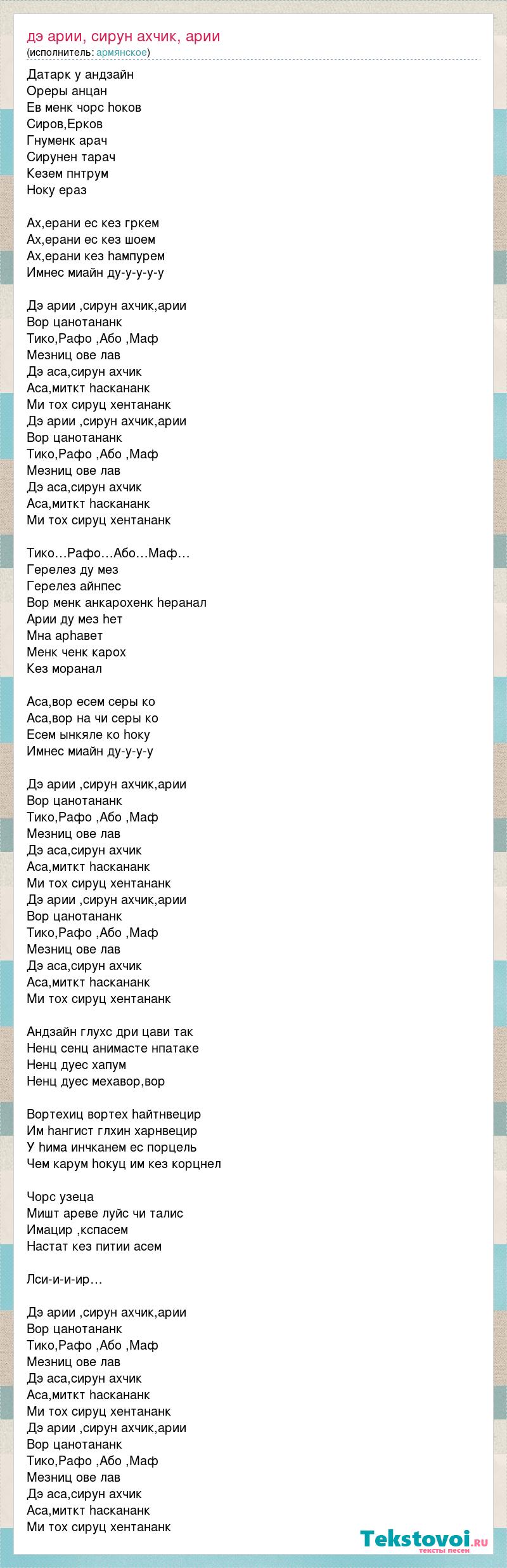 Датарк у андзайн Ореры анцан Ев менк чорс hоков Сиров,Ерков Гнуменк арач Сирунен тарач Кезем пнтрум Hоку ераз Ах,ерани ес кез гркем Ах,ерани ес кез шоем Ах,ерани кез hампурем Имнес миайн ду-у-у-у-у Дэ арии ,сирун ахчик,арии Вор цанотананк Тико,Рафо ,Або ,Маф Мезниц ове лав Дэ аса,сирун ахчик Аса,миткт hаскананк Ми тох сируц хентананк Дэ арии ,сирун ахчик,арии Вор цанотананк Тико,Рафо ,Або ,Маф Мезниц ове лав Дэ аса,сирун ахчик Аса,миткт hаскананк Ми тох сируц хентананк Тико…Рафо…Або…Маф… Герелез ду мез Герелез айнпес Вор менк анкарохенк hеранал Арии ду мез hет Мна арhавет Менк ченк карох Кез моранал Аса,вор есем серы ко Аса,вор на чи серы ко Есем ынкяле ко hоку Имнес миайн ду-у-у-у Дэ арии ,сирун ахчик,арии Вор цанотананк Тико,Рафо ,Або ,Маф Мезниц ове лав Дэ аса,сирун ахчик Аса,миткт hаскананк Ми тох сируц хентананк Дэ арии ,сирун ахчик,арии Вор цанотананк Тико,Рафо ,Або ,Маф Мезниц ове лав Дэ аса,сирун ахчик Аса,миткт hаскананк Ми тох сируц хентананк Андзайн глухс дри цави так Hенц сенц анимасте нпатаке Hенц дуес хапум Hенц дуес мехавор,вор Вортехиц вортех hайтнвецир Им hангист глхин харнвецир У hима инчканем ес порцель Чем карум hокуц им кез корцнел Чорс узеца Мишт ареве луйс чи талис Имацир ,кспасем Hастат кез питии асем Лси-и-и-ир… Дэ арии ,сирун ахчик,арии Вор цанотананк Тико,Рафо ,Або ,Маф Мезниц ове лав Дэ аса,сирун ахчик Аса,миткт hаскананк Ми тох сируц хентананк Дэ арии ,сирун ахчик,арии Вор цанотананк Тико,Рафо ,Або ,Маф Мезниц ове лав Дэ аса,сирун ахчик Аса,миткт hаскананк Ми тох сируц хентананк