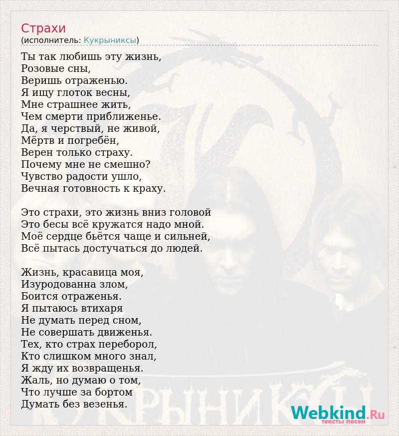 Ты так любишь эту жизнь, Розовые сны, Веришь отраженью. Я ищу глоток весны, Мне страшнее жить, Чем смерти приближенье. Да, я черствый, не живой, Мёртв и погребён, Верен только страху. Почему мне не смешно? Чувство радости ушло, Вечная готовность к краху. Это страхи, это жизнь вниз головой Это бесы всё кружатся надо мной. Моё сердце бьётся чаще и сильней, Всё пытась достучаться до людей. Жизнь, красавица моя, Изуродованна злом, Боится отраженья. Я пытаюсь втихаря Не думать перед сном, Не совершать движенья. Тех, кто страх переборол, Кто слишком много знал, Я жду их возвращенья. Жаль, но думаю о том, Что лучше за бортом Думать без везенья.