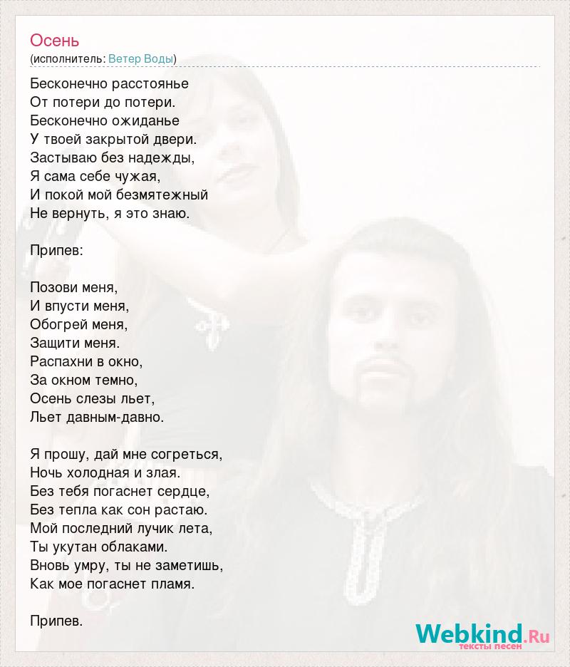 Бесконечно расстоянье От потери до потери. Бесконечно ожиданье У твоей закрытой двери. Застываю без надежды, Я сама себе чужая, И покой мой безмятежный Не вернуть, я это знаю. Припев: Позови меня, И впусти меня, Обогрей меня, Защити меня. Распахни в окно, За окном темно, Осень слезы льет, Льет давным-давно. Я прошу, дай мне согреться, Ночь холодная и злая. Без тебя погаснет сердце, Без тепла как сон растаю. Мой последний лучик лета, Ты укутан облаками. Вновь умру, ты не заметишь, Как мое погаснет пламя. Припев.