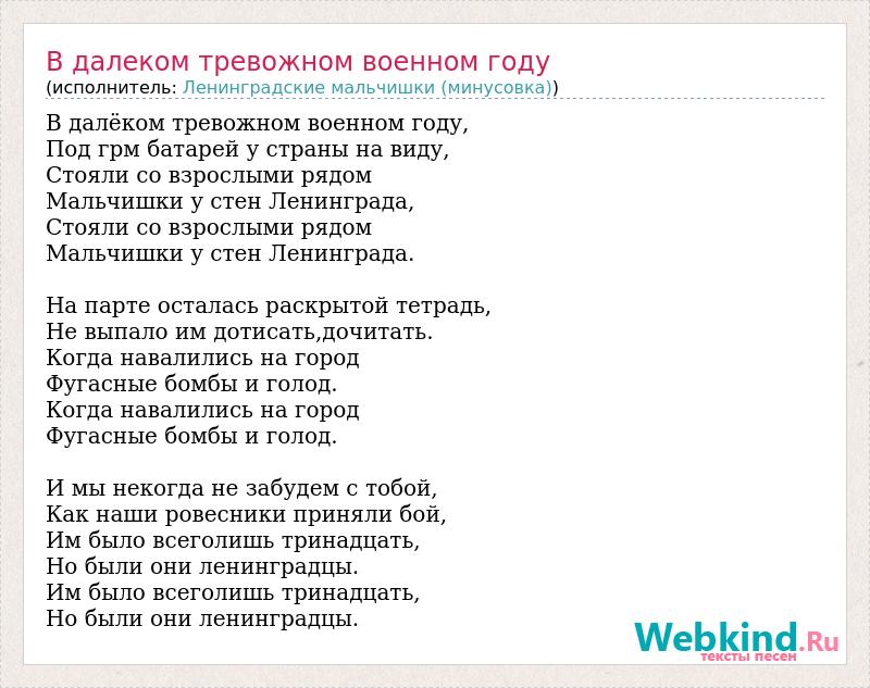 В далёком тревожном военном году, Под грм батарей у страны на виду, Стояли со взрослыми рядом Мальчишки у стен Ленинграда, Стояли со взрослыми рядом Мальчишки у стен Ленинграда. На парте осталась раскрытой тетрадь, Не выпало им дотисать,дочитать. Когда навалились на город Фугасные бомбы и голод. Когда навалились на город Фугасные бомбы и голод. И мы некогда не забудем с тобой, Как наши ровесники приняли бой, Им было всеголишь тринадцать, Но были они ленинградцы. Им было всеголишь тринадцать, Но были они ленинградцы.