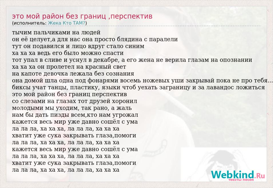 тычим пальчиками на людей он её целует,а для нас она просто блядина с паралели тут он подавился и лицо вдруг стало синим ха ха ха ведь его было можно спасти тот упал в сливе и уснул в декабре, а его жена не верила глазам на опознании ха ха ха он пролетел на красный свет на капоте девочка лежала без сознания она домой шла одна под фонарями восемь ножевых уши закрывай пока не про тебя... биксы учат танцы, пластику, языки чтоб уехать заграницу и за лавандос ложиться это мой район без границ перспектив со слезами на глазах тот друзей хоронил молодыми мы уходим, так рано, а жаль нам бы дать пизды всем,кто нам угрожал кажется весь мир уже давно сошёл с ума ла ла ла, ха ха ха, ла ла ла, ха ха ха хватит уже сука закрывать глаза,помоги ла ла ла, ха ха ха, ла ла ла, ха ха ха кажется весь мир уже давно сошёл с ума ла ла ла, ха ха ха, ла ла ла, ха ха ха хватит уже сука закрывать глаза,помоги ла ла ла, ха ха ха, ла ла ла, ха ха ха