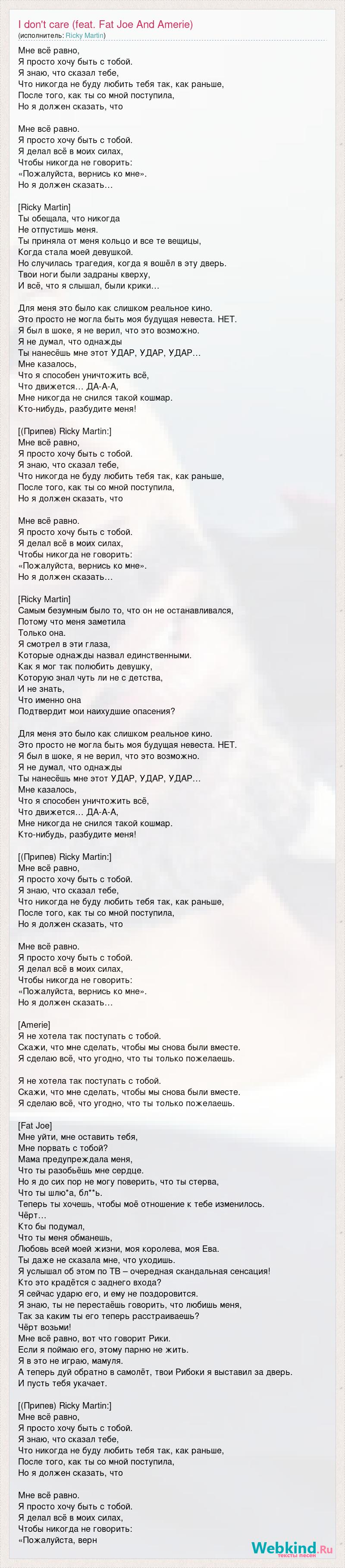 Мне всё равно, Я просто хочу быть с тобой. Я знаю, что сказал тебе, Что никогда не буду любить тебя так, как раньше, После того, как ты со мной поступила, Но я должен сказать, что Мне всё равно. Я просто хочу быть с тобой. Я делал всё в моих силах, Чтобы никогда не говорить: «Пожалуйста, вернись ко мне». Но я должен сказать… [Ricky Martin] Ты обещала, что никогда Не отпустишь меня. Ты приняла от меня кольцо и все те вещицы, Когда стала моей девушкой. Но случилась трагедия, когда я вошёл в эту дверь. Твои ноги были задраны кверху, И всё, что я слышал, были крики… Для меня это было как слишком реальное кино. Это просто не могла быть моя будущая невеста. НЕТ. Я был в шоке, я не верил, что это возможно. Я не думал, что однажды Ты нанесёшь мне этот УДАР, УДАР, УДАР… Мне казалось, Что я способен уничтожить всё, Что движется… ДА-А-А, Мне никогда не снился такой кошмар. Кто-нибудь, разбудите меня! [(Припев) Ricky Martin:] Мне всё равно, Я просто хочу быть с тобой. Я знаю, что сказал тебе, Что никогда не буду любить тебя так, как раньше, После того, как ты со мной поступила, Но я должен сказать, что Мне всё равно. Я просто хочу быть с тобой. Я делал всё в моих силах, Чтобы никогда не говорить: «Пожалуйста, вернись ко мне». Но я должен сказать… [Ricky Martin] Самым безумным было то, что он не останавливался, Потому что меня заметила Только она. Я смотрел в эти глаза, Которые однажды назвал единственными. Как я мог так полюбить девушку, Которую знал чуть ли не с детства, И не знать, Что именно она Подтвердит мои наихудшие опасения? Для меня это было как слишком реальное кино. Это просто не могла быть моя будущая невеста. НЕТ. Я был в шоке, я не верил, что это возможно. Я не думал, что однажды Ты нанесёшь мне этот УДАР, УДАР, УДАР… Мне казалось, Что я способен уничтожить всё, Что движется… ДА-А-А, Мне никогда не снился такой кошмар. Кто-нибудь, разбудите меня! [(Припев) Ricky Martin:] Мне всё равно, Я просто хочу быть с тобой. Я знаю, что сказал тебе, Что никогда не буду любить тебя так, как раньше, После того, как ты со мной поступила, Но я должен сказать, что Мне всё равно. Я просто хочу быть с тобой. Я делал всё в моих силах, Чтобы никогда не говорить: «Пожалуйста, вернись ко мне». Но я должен сказать… [Amerie] Я не хотела так поступать с тобой. Скажи, что мне сделать, чтобы мы снова были вместе. Я сделаю всё, что угодно, что ты только пожелаешь. Я не хотела так поступать с тобой. Скажи, что мне сделать, чтобы мы снова были вместе. Я сделаю всё, что угодно, что ты только пожелаешь. [Fat Joe] Мне уйти, мне оставить тебя, Мне порвать с тобой? Мама предупреждала меня, Что ты разобьёшь мне сердце. Но я до сих пор не могу поверить, что ты стерва, Что ты шлю*а, бл**ь. Теперь ты хочешь, чтобы моё отношение к тебе изменилось. Чёрт… Кто бы подумал, Что ты меня обманешь, Любовь всей моей жизни, моя королева, моя Ева. Ты даже не сказала мне, что уходишь. Я услышал об этом по ТВ – очередная скандальная сенсация! Кто это крадётся с заднего входа? Я сейчас ударю его, и ему не поздоровится. Я знаю, ты не перестаёшь говорить, что любишь меня, Так за каким ты его теперь расстраиваешь? Чёрт возьми! Мне всё равно, вот что говорит Рики. Если я поймаю его, этому парню не жить. Я в это не играю, мамуля. А теперь дуй обратно в самолёт, твои Рибоки я выставил за дверь. И пусть тебя укачает. [(Припев) Ricky Martin:] Мне всё равно, Я просто хочу быть с тобой. Я знаю, что сказал тебе, Что никогда н