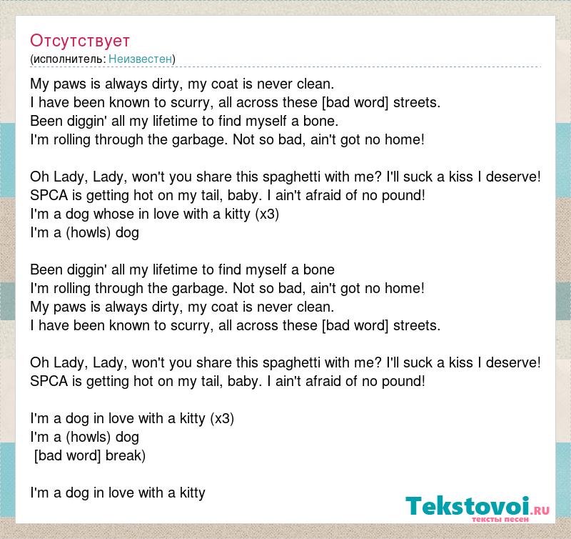 My paws is always dirty, my coat is never clean. I have been known to scurry, all across these [bad word] streets. Been diggin' all my lifetime to find myself a bone. I'm rolling through the garbage. Not so bad, ain't got no home! Oh Lady, Lady, won't you share this spaghetti with me? I'll suck a kiss I deserve! SPCA is getting hot on my tail, baby. I ain't afraid of no pound! I'm a dog whose in love with a kitty (x3) I'm a (howls) dog Been diggin' all my lifetime to find myself a bone I'm rolling through the garbage. Not so bad, ain't got no home! My paws is always dirty, my coat is never clean. I have been known to scurry, all across these [bad word] streets. Oh Lady, Lady, won't you share this spaghetti with me? I'll suck a kiss I deserve! SPCA is getting hot on my tail, baby. I ain't afraid of no pound! I'm a dog in love with a kitty (x3) I'm a (howls) dog (instrumental break) I'm a dog in love with a kitty