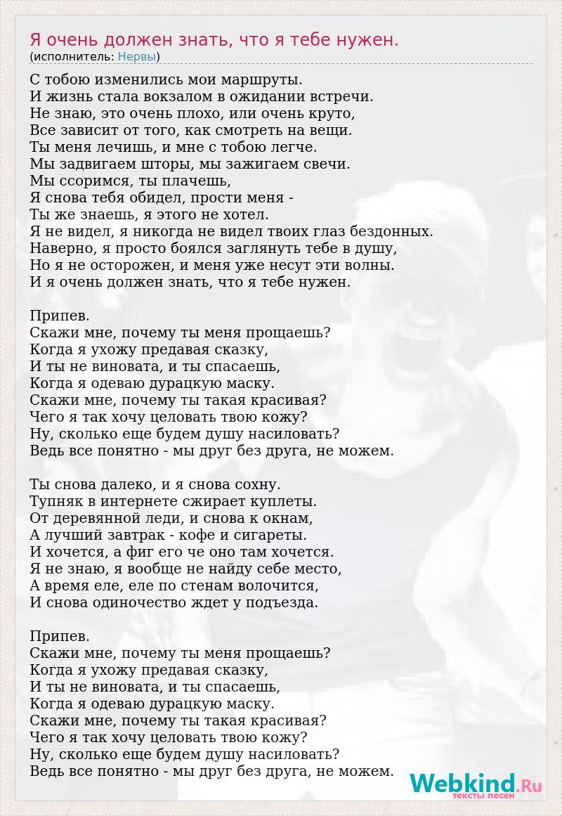 С тобою изменились мои маршруты. И жизнь стала вокзалом в ожидании встречи. Не знаю, это очень плохо, или очень круто, Все зависит от того, как смотреть на вещи. Ты меня лечишь, и мне с тобою легче. Мы задвигаем шторы, мы зажигаем свечи. Мы ссоримся, ты плачешь, Я снова тебя обидел, прости меня - Ты же знаешь, я этого не хотел. Я не видел, я никогда не видел твоих глаз бездонных. Наверно, я просто боялся заглянуть тебе в душу, Но я не осторожен, и меня уже несут эти волны. И я очень должен знать, что я тебе нужен. Припев. Скажи мне, почему ты меня прощаешь? Когда я ухожу предавая сказку, И ты не виновата, и ты спасаешь, Когда я одеваю дурацкую маску. Скажи мне, почему ты такая красивая? Чего я так хочу целовать твою кожу? Ну, сколько еще будем душу насиловать? Ведь все понятно - мы друг без друга, не можем. Ты снова далеко, и я снова сохну. Тупняк в интернете сжирает куплеты. От деревянной леди, и снова к окнам, А лучший завтрак - кофе и сигареты. И хочется, а фиг его че оно там хочется. Я не знаю, я вообще не найду себе место, А время еле, еле по стенам волочится, И снова одиночество ждет у подъезда. Припев. Скажи мне, почему ты меня прощаешь? Когда я ухожу предавая сказку, И ты не виновата, и ты спасаешь, Когда я одеваю дурацкую маску. Скажи мне, почему ты такая красивая? Чего я так хочу целовать твою кожу? Ну, сколько еще будем душу насиловать? Ведь все понятно - мы друг без друга, не можем.