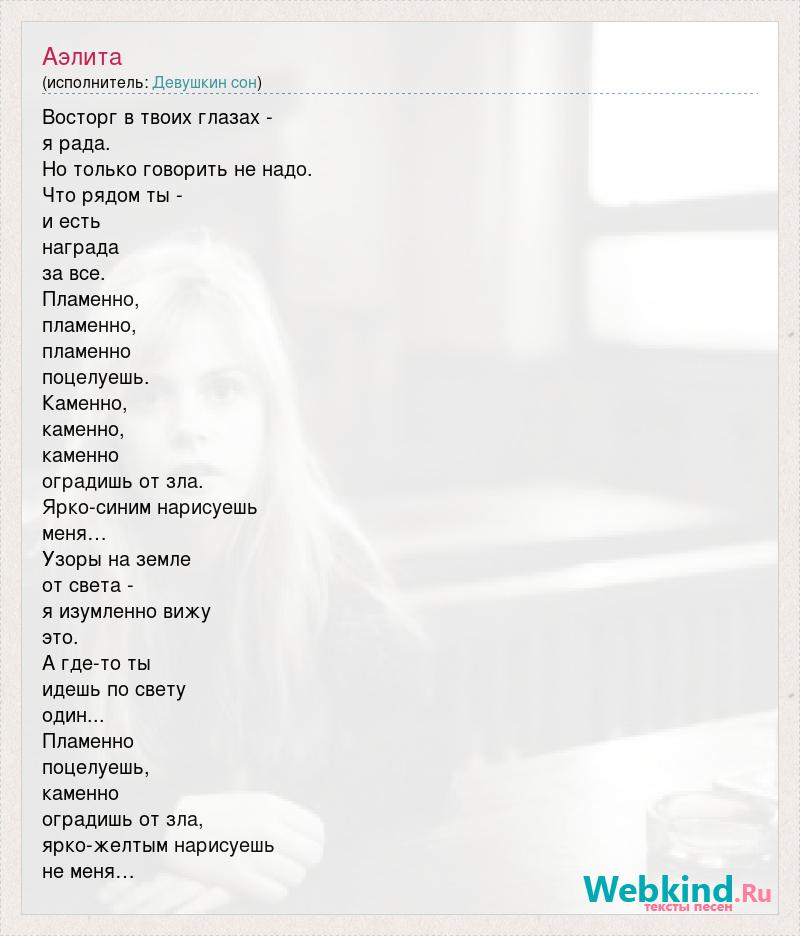 Восторг в твоих глазах - я рада. Но только говорить не надо. Что рядом ты - и есть награда за все. Пламенно, пламенно, пламенно поцелуешь. Каменно, каменно, каменно оградишь от зла. Ярко-синим нарисуешь меня… Узоры на земле от света - я изумленно вижу это. А где-то ты идешь по свету один... Пламенно поцелуешь, каменно оградишь от зла, ярко-желтым нарисуешь не меня…