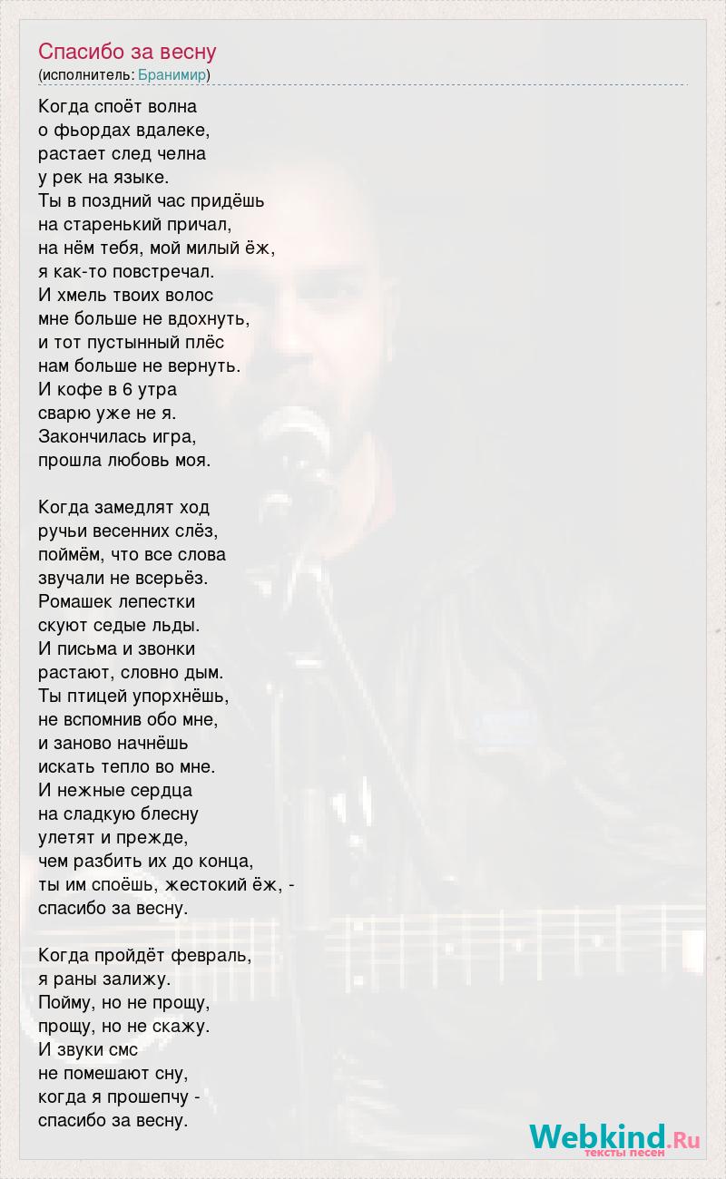 Когда споёт волна о фьордах вдалеке, растает след челна у рек на языке. Ты в поздний час придёшь на старенький причал, на нём тебя, мой милый ёж, я как-то повстречал. И хмель твоих волос мне больше не вдохнуть, и тот пустынный плёс нам больше не вернуть. И кофе в 6 утра сварю уже не я. Закончилась игра, прошла любовь моя. Когда замедлят ход ручьи весенних слёз, поймём, что все слова звучали не всерьёз. Ромашек лепестки скуют седые льды. И письма и звонки растают, словно дым. Ты птицей упорхнёшь, не вспомнив обо мне, и заново начнёшь искать тепло во мне. И нежные сердца на сладкую блесну улетят и прежде, чем разбить их до конца, ты им споёшь, жестокий ёж, - спасибо за весну. Когда пройдёт февраль, я раны залижу. Пойму, но не прощу, прощу, но не скажу. И звуки смс не помешают сну, когда я прошепчу - спасибо за весну.