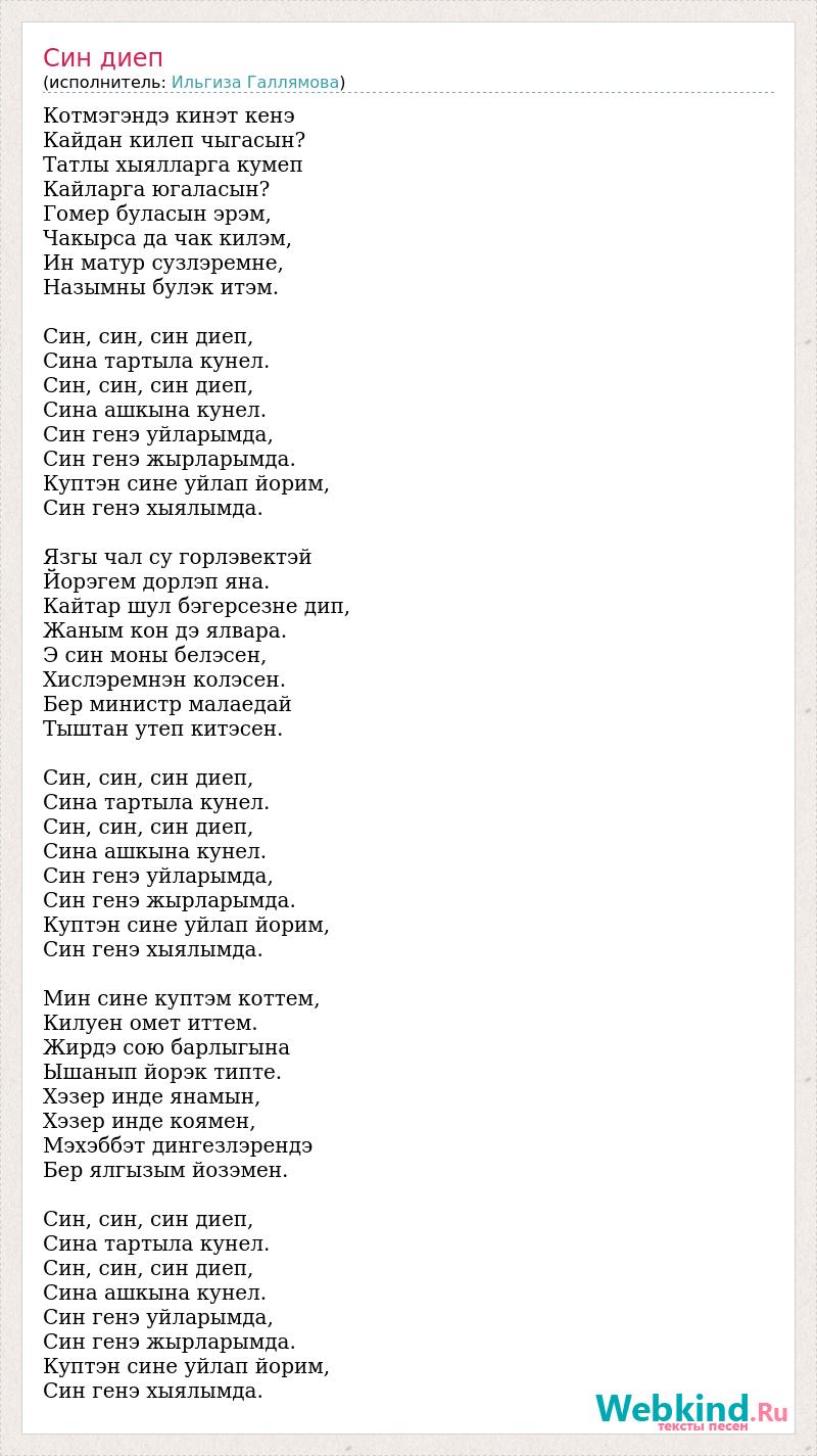 Котмэгэндэ кинэт кенэ Кайдан килеп чыгасын? Татлы хыялларга кумеп Кайларга югаласын? Гомер буласын эрэм, Чакырса да чак килэм, Ин матур сузлэремне, Назымны булэк итэм. Син, син, син диеп, Сина тартыла кунел. Син, син, син диеп, Сина ашкына кунел. Син генэ уйларымда, Син генэ жырларымда. Куптэн сине уйлап йорим, Син генэ хыялымда. Язгы чал су горлэвектэй Йорэгем дорлэп яна. Кайтар шул бэгерсезне дип, Жаным кон дэ ялвара. Э син моны белэсен, Хислэремнэн колэсен. Бер министр малаедай Тыштан утеп китэсен. Син, син, син диеп, Сина тартыла кунел. Син, син, син диеп, Сина ашкына кунел. Син генэ уйларымда, Син генэ жырларымда. Куптэн сине уйлап йорим, Син генэ хыялымда. Мин сине куптэм коттем, Килуен омет иттем. Жирдэ сою барлыгына Ышанып йорэк типте. Хэзер инде янамын, Хэзер инде коямен, Мэхэббэт дингезлэрендэ Бер ялгызым йозэмен. Син, син, син диеп, Сина тартыла кунел. Син, син, син диеп, Сина ашкына кунел. Син генэ уйларымда, Син генэ жырларымда. Куптэн сине уйлап йорим, Син генэ хыялымда.