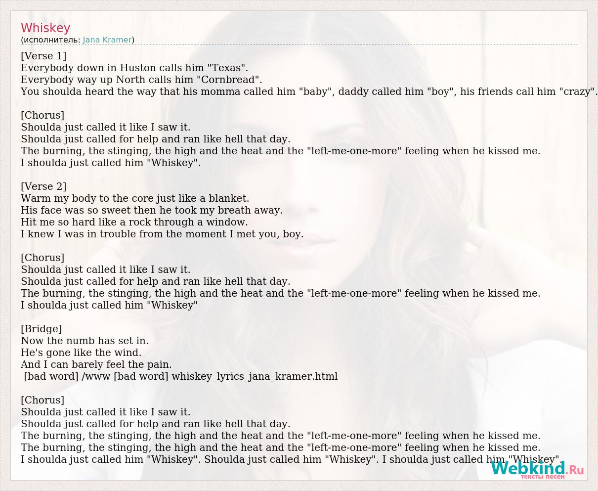 [Verse 1] Everybody down in Huston calls him "Texas". Everybody way up North calls him "Cornbread". You shoulda heard the way that his momma called him "baby", daddy called him "boy", his friends call him "crazy". [Chorus] Shoulda just called it like I saw it. Shoulda just called for help and ran like hell that day. The burning, the stinging, the high and the heat and the "left-me-one-more" feeling when he kissed me. I shoulda just called him "Whiskey". [Verse 2] Warm my body to the core just like a blanket. His face was so sweet then he took my breath away. Hit me so hard like a rock through a window. I knew I was in trouble from the moment I met you, boy. [Chorus] Shoulda just called it like I saw it. Shoulda just called for help and ran like hell that day. The burning, the stinging, the high and the heat and the "left-me-one-more" feeling when he kissed me. I shoulda just called him "Whiskey" [Bridge] Now the numb has set in. He's gone like the wind. And I can barely feel the pain. [bad word] /www [bad word] whiskey_lyrics_jana_kramer.html [Chorus] Shoulda just called it like I saw it. Shoulda just called for help and ran like hell that day. The burning, the stinging, the high and the heat and the "left-me-one-more" feeling when he kissed me. The burning, the stinging, the high and the heat and the "left-me-one-more" feeling when he kissed me. I shoulda just called him "Whiskey". Shoulda just called him "Whiskey". I shoulda just called him "Whiskey".