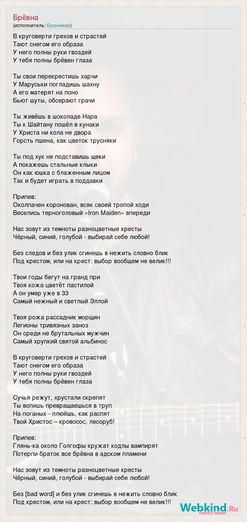 В круговерти грехов и страстей Тают снегом его образа У него полны руки гвоздей У тебя полны брёвен глаза Ты свои перекрестишь харчи У Маруськи погладишь шахну А его матерят на поно Бьют шуты, обсерают грачи Ты живёшь в шоколаде Нара Ты к Шайтану пошёл в кунаки У Христа ни кола не двора Горсть пшена, как цветок трусняки Ты под хук не подставишь щеки А покажешь стальные клыки Он как юшка с блаженным лицом Так и будет играть в поддавки Припев: Околпачен коронован, всяк своей тропой ходи Веселись терноголовый «Iron Maiden» впереди Нас зовут из темноты разноцветные кресты Чёрный, синий, голубой - выбирай себе любой! Без следов и без улик сгинешь в нежить словно блик Под крестом, или на крест: выбор вообщем не велик!!! Твои годы бегут на гранд при Твоя кожа цветёт пастилой А он умер уже в 33 Самый нежный и светлый Эллой Твоя рожа рассадник морщин Легионы тривязных заноз Он среди не брутальных мужчин Самый хрупкий святой альбинос В круговерти грехов и страстей Тают снегом его образа У него полны руки гвоздей У тебя полны брёвен глаза Сучья режут, хрустали скрепят Ты вопишь превращаешься в труп На поганых - плюёшь, как распят Твой Христос – кровосос, лесоруб! Припев: Глянь-ка около Голгофы кружат кодлы вампирят Потерпи браток все брёвна в адском пламени Нас зовут из темноты разноцветные кресты Чёрный, синий, голубой - выбирай себе любой! Без [bad word] и без улик сгинешь в нежить словно блик Под крестом, или на крест: выбор вообщем не велик!!!