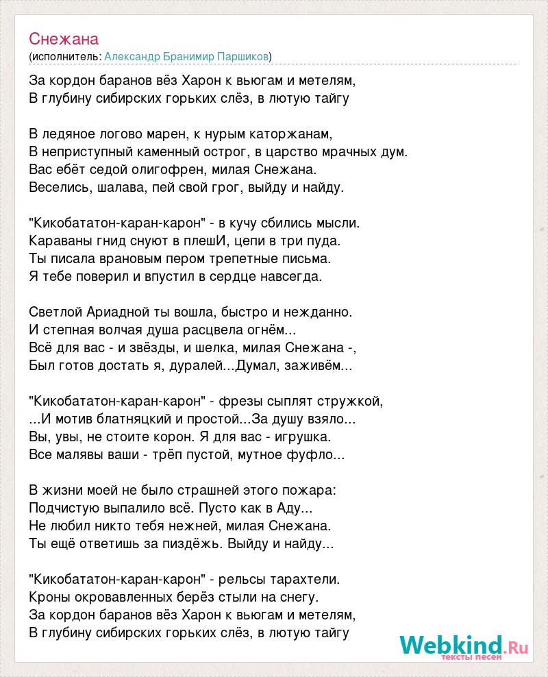 За кордон баранов вёз Харон к вьюгам и метелям, В глубину сибирских горьких слёз, в лютую тайгу В ледяное логово марен, к нурым каторжанам, В неприступный каменный острог, в царство мрачных дум. Вас ебёт седой олигофрен, милая Снежана. Веселись, шалава, пей свой грог, выйду и найду. "Кикобататон-каран-карон" - в кучу сбились мысли. Караваны гнид снуют в плешИ, цепи в три пуда. Ты писала врановым пером трепетные письма. Я тебе поверил и впустил в сердце навсегда. Светлой Ариадной ты вошла, быстро и нежданно. И степная волчая душа расцвела огнём... Всё для вас - и звёзды, и шелка, милая Снежана -, Был готов достать я, дуралей...Думал, заживём... "Кикобататон-каран-карон" - фрезы сыплят стружкой, ...И мотив блатняцкий и простой...За душу взяло... Вы, увы, не стоите корон. Я для вас - игрушка. Все малявы ваши - трёп пустой, мутное фуфло... В жизни моей не было страшней этого пожара: Подчистую выпалило всё. Пусто как в Аду... Не любил никто тебя нежней, милая Снежана. Ты ещё ответишь за пиздёжь. Выйду и найду... "Кикобататон-каран-карон" - рельсы тарахтели. Кроны окровавленных берёз стыли на снегу. За кордон баранов вёз Харон к вьюгам и метелям, В глубину сибирских горьких слёз, в лютую тайгу