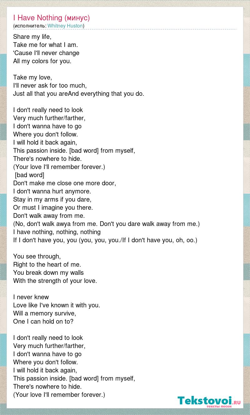 Share my life, Take me for what I am. 'Cause I'll never change All my colors for you. Take my love, I'll never ask for too much, Just all that you areAnd everything that you do. I don't really need to look Very much further/farther, I don't wanna have to go Where you don't follow. I will hold it back again, This passion inside. Can't run from myself, There's nowhere to hide. (Your love I'll remember forever.) Chorus: Don't make me close one more door, I don't wanna hurt anymore. Stay in my arms if you dare, Or must I imagine you there. Don't walk away from me. (No, don't walk awya from me. Don't you dare walk away from me.) I have nothing, nothing, nothing If I don't have you, you (you, you, you./If I don't have you, oh, oo.) You see through, Right to the heart of me. You break down my walls With the strength of your love. I never knew Love like I've known it with you. Will a memory survive, One I can hold on to? I don't really need to look Very much further/farther, I don't wanna have to go Where you don't follow. I will hold it back again, This passion inside. Can't run from myself, There's nowhere to hide. (Your love I'll remember forever.)