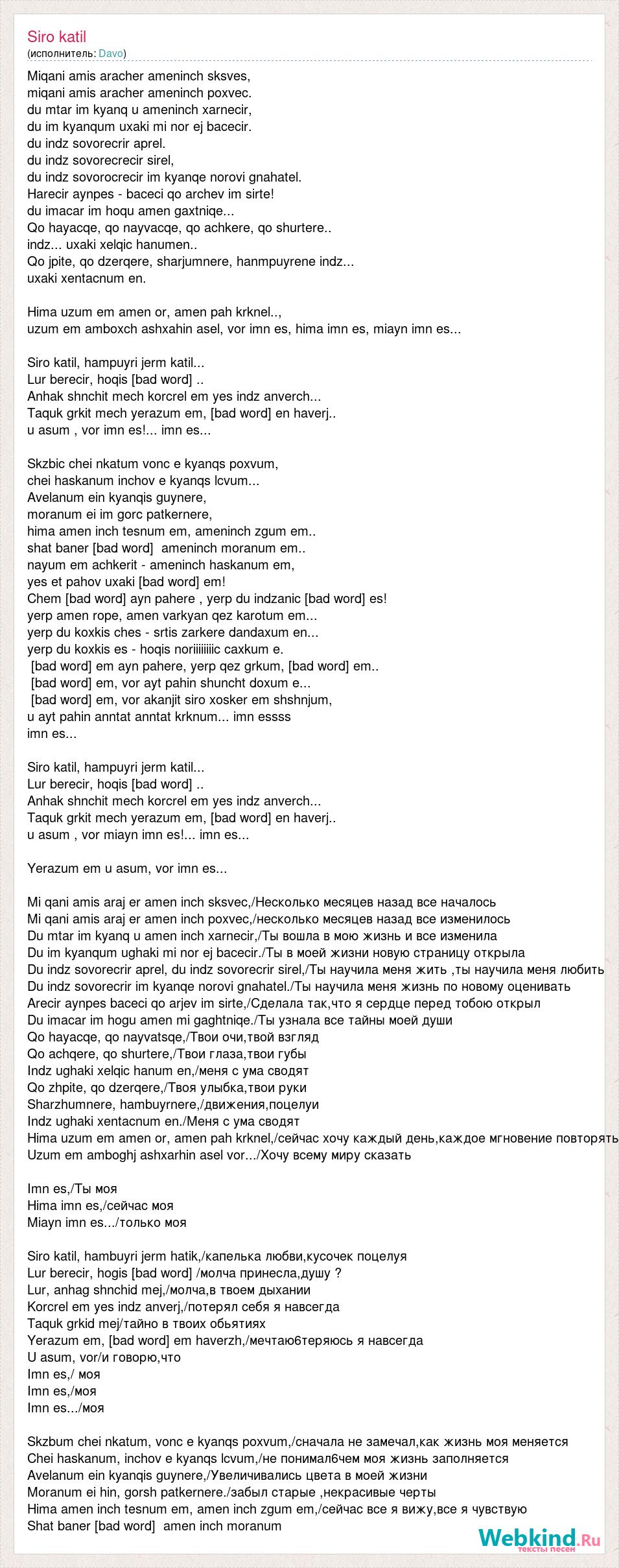 Miqani amis aracher ameninch sksves, miqani amis aracher ameninch poxvec. du mtar im kyanq u ameninch xarnecir, du im kyanqum uxaki mi nor ej bacecir. du indz sovorecrir aprel. du indz sovorecrecir sirel, du indz sovorocrecir im kyanqe norovi gnahatel. Harecir aynpes - baceci qo archev im sirte! du imacar im hoqu amen gaxtniqe... Qo hayacqe, qo nayvacqe, qo achkere, qo shurtere.. indz... uxaki xelqic hanumen.. Qo jpite, qo dzerqere, sharjumnere, hanmpuyrene indz... uxaki xentacnum en. Hima uzum em amen or, amen pah krknel.., uzum em amboxch ashxahin asel, vor imn es, hima imn es, miayn imn es... Siro katil, hampuyri jerm katil... Lur berecir, hoqis [bad word] .. Anhak shnchit mech korcrel em yes indz anverch... Taquk grkit mech yerazum em, [bad word] en haverj.. u asum , vor imn es!... imn es... Skzbic chei nkatum vonc e kyanqs poxvum, chei haskanum inchov e kyanqs lcvum... Avelanum ein kyanqis guynere, moranum ei im gorc patkernere, hima amen inch tesnum em, ameninch zgum em.. shat baner [bad word] ameninch moranum em.. nayum em achkerit - ameninch haskanum em, yes et pahov uxaki [bad word] em! Chem [bad word] ayn pahere , yerp du indzanic [bad word] es! yerp amen rope, amen varkyan qez karotum em... yerp du koxkis ches - srtis zarkere dandaxum en... yerp du koxkis es - hoqis noriiiiiiiic caxkum e. [bad word] em ayn pahere, yerp qez grkum, [bad word] em.. [bad word] em, vor ayt pahin shuncht doxum e... [bad word] em, vor akanjit siro xosker em shshnjum, u ayt pahin anntat anntat krknum... imn essss imn es... Siro katil, hampuyri jerm katil... Lur berecir, hoqis [bad word] .. Anhak shnchit mech korcrel em yes indz anverch... Taquk grkit mech yerazum em, [bad word] en haverj.. u asum , vor miayn imn es!... imn es... Yerazum em u asum, vor imn es... Mi qani amis araj er amen inch sksvec,/Несколько месяцев назад все началось Mi qani amis araj er amen inch poxvec,/несколько месяцев назад все изменилось Du mtar im kyanq u amen inch xarnecir,/Ты вошла в мою жизнь и все изменила Du im kyanqum ughaki mi nor ej bacecir./Ты в моей жизни новую страницу открыла Du indz sovorecrir aprel, du indz sovorecrir sirel,/Ты научила меня жить ,ты научила меня любить Du indz sovorecrir im kyanqe norovi gnahatel./Ты научила меня жизнь по новому оценивать Arecir aynpes baceci qo arjev im sirte,/Сделала так,что я сердце перед тобою открыл Du imacar im hogu amen mi gaghtniqe./Ты узнала все тайны моей души Qo hayacqe, qo nayvatsqe,/Твои очи,твой взгляд Qo achqere, qo shurtere,/Твои глаза,твои губы Indz ughaki xelqic hanum en,/меня с ума сводят Qo zhpite, qo dzerqere,/Твоя улыбка,твои руки Sharzhumnere, hambuyrnere,/движения,поцелуи Indz ughaki xentacnum en./Меня с ума сводят Hima uzum em amen or, amen pah krknel,/сейчас хочу каждый день,каждое мгновение повторять Uzum em amboghj ashxarhin asel vor.../Хочу всему миру сказать Imn es,/Ты моя Hima imn es,/сейчас моя Miayn imn es.../только моя Siro katil, hambuyri jerm hatik,/капелька любви,кусочек поцелуя Lur berecir, hogis [bad word] /молча принесла,душу ? Lur, anhag shnchid mej,/молча,в твоем дыхании Korcrel em yes indz anverj,/потерял себя я навсегда Taquk grkid mej/тайно в твоих обьятиях Yerazum em, [bad word] em haverzh,/мечтаю6теряюсь я навсегда U asum, vor/и говорю,что Imn es,/ моя Imn es,/моя Imn es.../моя Skzbum chei nkatum, vonc e kyanqs poxvum,/сначала не замечал,как жизнь моя меняется Chei haskanum, inchov e kyanqs lcvum,/не понимал6чем моя жизнь заполняется Avelanum ein kyanqis guynere,/Увеличивались цвета в моей жизни Moranum ei hin, gorsh patkernere./забыл старые ,некрасивые черты Hima amen inch tesnum em, amen inch zgum em,/сейчас все я вижу,все я чувствую Shat baner [bad word] amen inch moranum