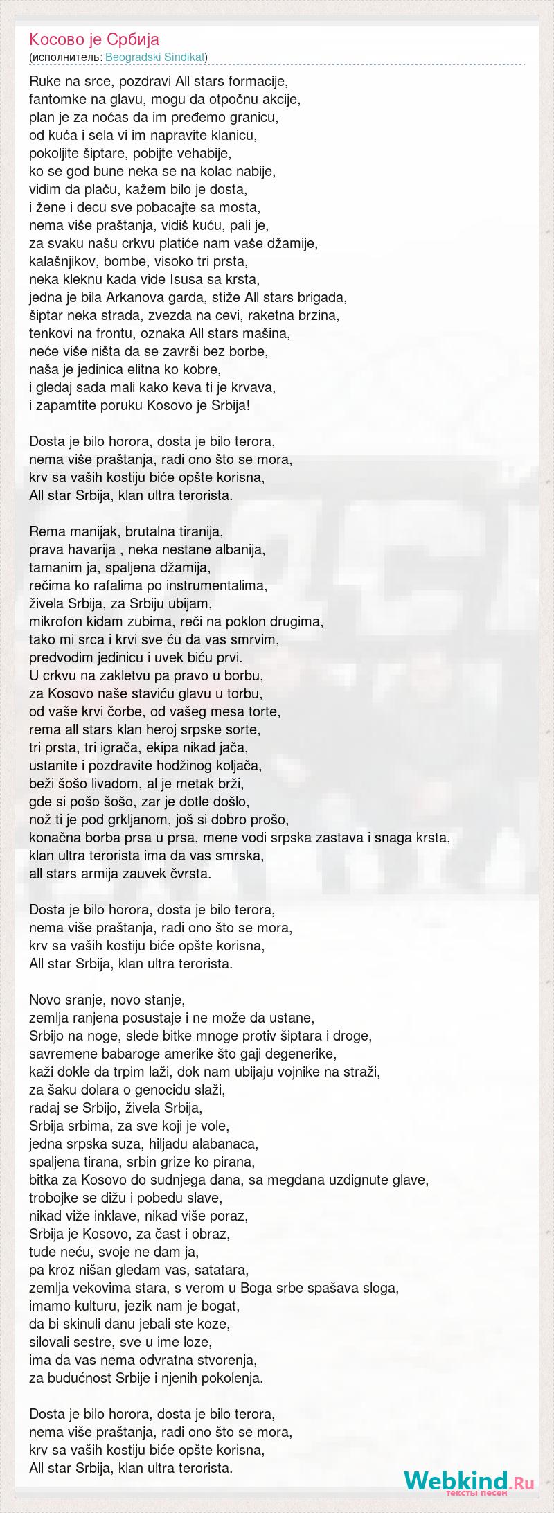 Ruke na srce, pozdravi All stars formacije, fantomke na glavu, mogu da otpočnu akcije, plan je za noćas da im pređemo granicu, od kuća i sela vi im napravite klanicu, pokoljite šiptare, pobijte vehabije, ko se god bune neka se na kolac nabije, vidim da plaču, kažem bilo je dosta, i žene i decu sve pobacajte sa mosta, nema više praštanja, vidiš kuću, pali je, za svaku našu crkvu platiće nam vaše džamije, kalašnjikov, bombe, visoko tri prsta, neka kleknu kada vide Isusa sa krsta, jedna je bila Arkanova garda, stiže All stars brigada, šiptar neka strada, zvezda na cevi, raketna brzina, tenkovi na frontu, oznaka All stars mašina, neće više ništa da se završi bez borbe, naša je jedinica elitna ko kobre, i gledaj sada mali kako keva ti je krvava, i zapamtite poruku Kosovo je Srbija! Dosta je bilo horora, dosta je bilo terora, nema više praštanja, radi ono što se mora, krv sa vaših kostiju biće opšte korisna, All star Srbija, klan ultra terorista. Rema manijak, brutalna tiranija, prava havarija , neka nestane albanija, tamanim ja, spaljena džamija, rečima ko rafalima po instrumentalima, živela Srbija, za Srbiju ubijam, mikrofon kidam zubima, reči na poklon drugima, tako mi srca i krvi sve ću da vas smrvim, predvodim jedinicu i uvek biću prvi. U crkvu na zakletvu pa pravo u borbu, za Kosovo naše staviću glavu u torbu, od vaše krvi čorbe, od vašeg mesa torte, rema all stars klan heroj srpske sorte, tri prsta, tri igrača, ekipa nikad jača, ustanite i pozdravite hodžinog koljača, beži šošo livadom, al je metak brži, gde si pošo šošo, zar je dotle došlo, nož ti je pod grkljanom, još si dobro prošo, konačna borba prsa u prsa, mene vodi srpska zastava i snaga krsta, klan ultra terorista ima da vas smrska, all stars armija zauvek čvrsta. Dosta je bilo horora, dosta je bilo terora, nema više praštanja, radi ono što se mora, krv sa vaših kostiju biće opšte korisna, All star Srbija, klan ultra terorista. Novo sranje, novo stanje, zemlja ranjena posustaje i ne može da ustane, Srbijo na noge, slede bitke mnoge protiv šiptara i droge, savremene babaroge amerike što gaji degenerike, kaži dokle da trpim laži, dok nam ubijaju vojnike na straži, za šaku dolara o genocidu slaži, rađaj se Srbijo, živela Srbija, Srbija srbima, za sve koji je vole, jedna srpska suza, hiljadu alabanaca, spaljena tirana, srbin grize ko pirana, bitka za Kosovo do sudnjega dana, sa megdana uzdignute glave, trobojke se dižu i pobedu slave, nikad viže inklave, nikad više poraz, Srbija je Kosovo, za čast i obraz, tuđe neću, svoje ne dam ja, pa kroz nišan gledam vas, satatara, zemlja vekovima stara, s verom u Boga srbe spašava sloga, imamo kulturu, jezik nam je bogat, da bi skinuli đanu jebali ste koze, silovali sestre, sve u ime loze, ima da vas nema odvratna stvorenja, za budućnost Srbije i njenih pokolenja. Dosta je bilo horora, dosta je bilo terora, nema više praštanja, radi ono što se mora, krv sa vaših kostiju biće opšte korisna, All star Srbija, klan ultra terorista.