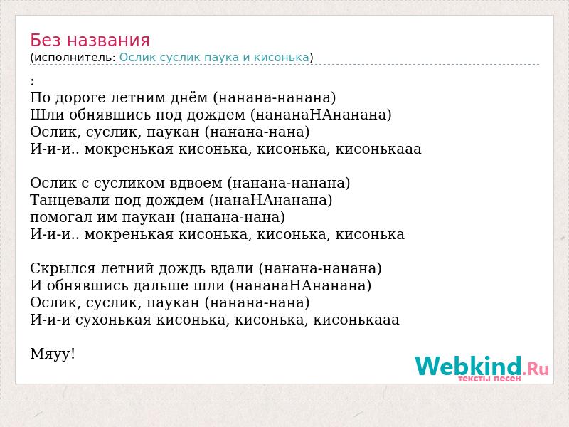 : По дороге летним днём (нанана-нанана) Шли обнявшись под дождем (нананаНАнанана) Ослик, суслик, паукан (нанана-нана) И-и-и.. мокренькая кисонька, кисонька, кисонькааа Ослик с сусликом вдвоем (нанана-нанана) Танцевали под дождем (нанаНАнанана) помогал им паукан (нанана-нана) И-и-и.. мокренькая кисонька, кисонька, кисонька Скрылся летний дождь вдали (нанана-нанана) И обнявшись дальше шли (нананаНАнанана) Ослик, суслик, паукан (нанана-нана) И-и-и сухонькая кисонька, кисонька, кисонькааа Мяуу!