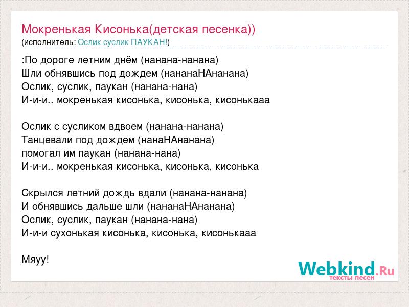 :По дороге летним днём (нанана-нанана) Шли обнявшись под дождем (нананаНАнанана) Ослик, суслик, паукан (нанана-нана) И-и-и.. мокренькая кисонька, кисонька, кисонькааа Ослик с сусликом вдвоем (нанана-нанана) Танцевали под дождем (нанаНАнанана) помогал им паукан (нанана-нана) И-и-и.. мокренькая кисонька, кисонька, кисонька Скрылся летний дождь вдали (нанана-нанана) И обнявшись дальше шли (нананаНАнанана) Ослик, суслик, паукан (нанана-нана) И-и-и сухонькая кисонька, кисонька, кисонькааа Мяуу!