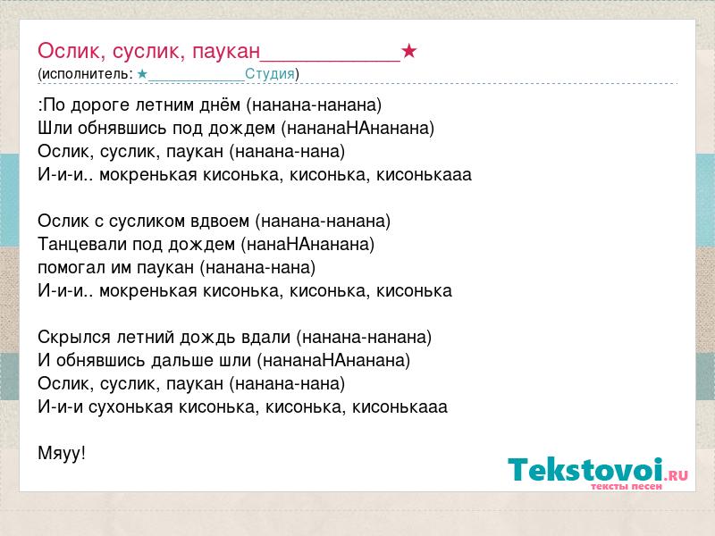 :По дороге летним днём (нанана-нанана) Шли обнявшись под дождем (нананаНАнанана) Ослик, суслик, паукан (нанана-нана) И-и-и.. мокренькая кисонька, кисонька, кисонькааа Ослик с сусликом вдвоем (нанана-нанана) Танцевали под дождем (нанаНАнанана) помогал им паукан (нанана-нана) И-и-и.. мокренькая кисонька, кисонька, кисонька Скрылся летний дождь вдали (нанана-нанана) И обнявшись дальше шли (нананаНАнанана) Ослик, суслик, паукан (нанана-нана) И-и-и сухонькая кисонька, кисонька, кисонькааа Мяуу!