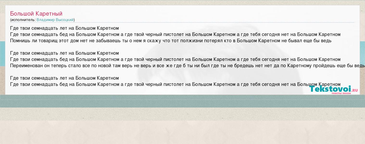 Где твои семнадцать лет на Большом Каретном Где твои семнадцать бед на Большом Каретном а где твой черный пистолет на Большом Каретном а где тебя сегодня нет на Большом Каретном Помнишь ли товарищ этот дом нет не забываешь ты о нем я скажу что тот полжизни потерял кто в Большом Каретном не бывал еще бы ведь Где твои семнадцать лет на Большом Каретном Где твои семнадцать бед на Большом Каретном а где твой черный пистолет на Большом Каретном а где тебя сегодня нет на Большом Каретном Переименован он теперь стало все по новой там верь не верь и все же где б ты ни был где ты не бредешь нет нет да по Каретному пройдешь еще бы ведь Где твои семнадцать лет на Большом Каретном Где твои семнадцать бед на Большом Каретном а где твой черный пистолет на Большом Каретном а где тебя сегодня нет на Большом Каретном
