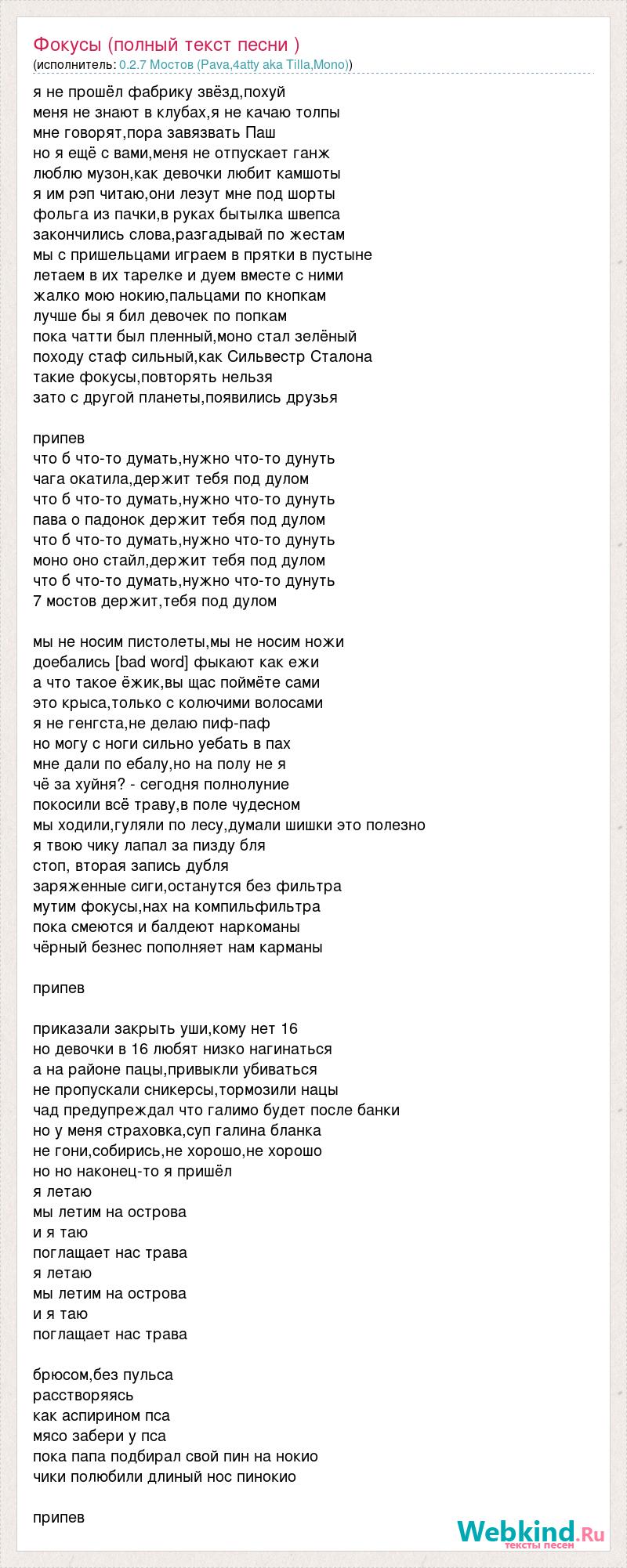 я не прошёл фабрику звёзд,похуй меня не знают в клубах,я не качаю толпы мне говорят,пора завязвать Паш но я ещё с вами,меня не отпускает ганж люблю музон,как девочки любит камшоты я им рэп читаю,они лезут мне под шорты фольга из пачки,в руках бытылка швепса закончились слова,разгадывай по жестам мы с пришельцами играем в прятки в пустыне летаем в их тарелке и дуем вместе с ними жалко мою нокию,пальцами по кнопкам лучше бы я бил девочек по попкам пока чатти был пленный,моно стал зелёный походу стаф сильный,как Сильвестр Сталона такие фокусы,повторять нельзя зато с другой планеты,появились друзья припев что б что-то думать,нужно что-то дунуть чага окатила,держит тебя под дулом что б что-то думать,нужно что-то дунуть пава о падонок держит тебя под дулом что б что-то думать,нужно что-то дунуть моно оно стайл,держит тебя под дулом что б что-то думать,нужно что-то дунуть 7 мостов держит,тебя под дулом мы не носим пистолеты,мы не носим ножи доебались [bad word] фыкают как ежи а что такое ёжик,вы щас поймёте сами это крыса,только с колючими волосами я не генгста,не делаю пиф-паф но могу с ноги сильно уебать в пах мне дали по ебалу,но на полу не я чё за хуйня? - сегодня полнолуние покосили всё траву,в поле чудесном мы ходили,гуляли по лесу,думали шишки это полезно я твою чику лапал за пизду бля стоп, вторая запись дубля заряженные сиги,останутся без фильтра мутим фокусы,нах на компильфильтра пока смеются и балдеют наркоманы чёрный безнес пополняет нам карманы припев приказали закрыть уши,кому нет 16 но девочки в 16 любят низко нагинаться а на районе пацы,привыкли убиваться не пропускали сникерсы,тормозили нацы чад предупреждал что галимо будет после банки но у меня страховка,суп галина бланка не гони,собирись,не хорошо,не хорошо но но наконец-то я пришёл я летаю мы летим на острова и я таю поглащает нас трава я летаю мы летим на острова и я таю поглащает нас трава брюсом,без пульса расстворяясь как аспирином пса мясо забери у пса пока папа подбирал свой пин на нокио чики полюбили длиный нос пинокио припев