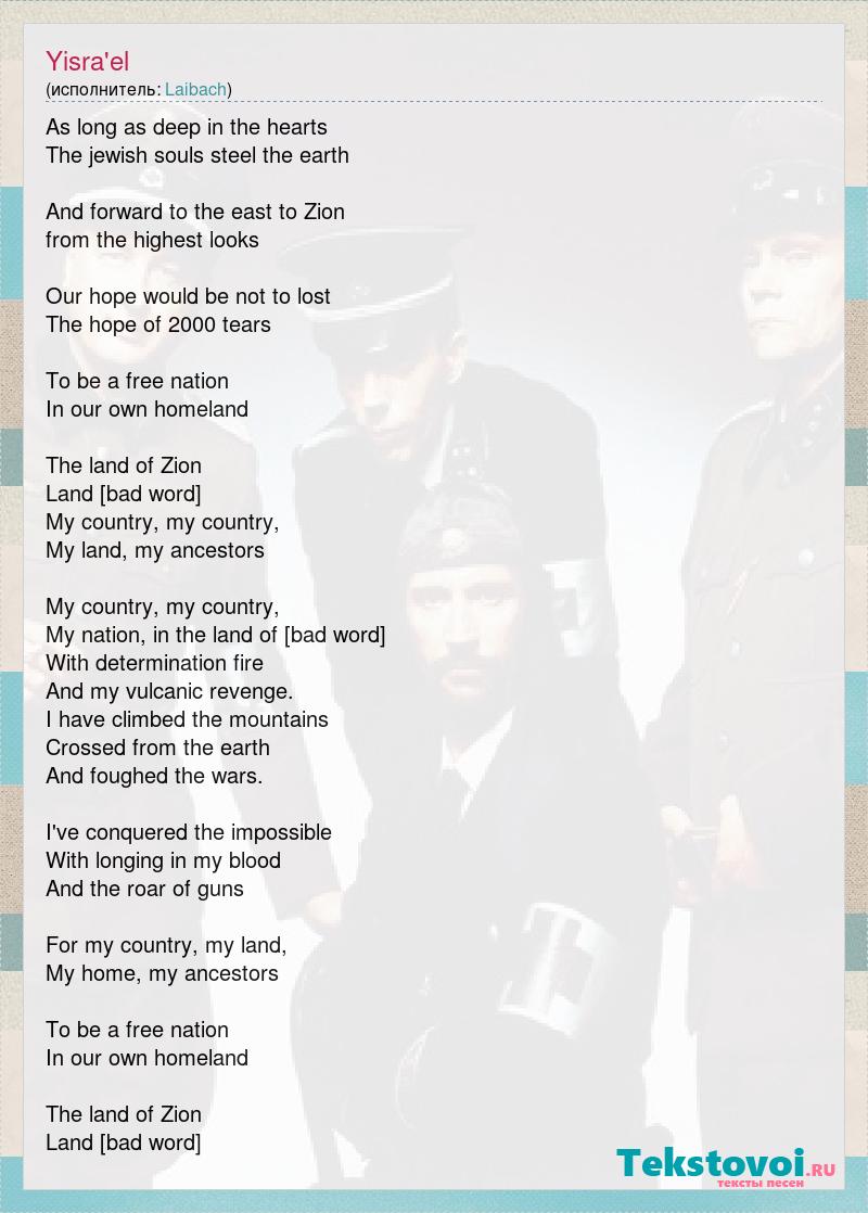 As long as deep in the hearts The jewish souls steel the earth And forward to the east to Zion from the highest looks Our hope would be not to lost The hope of 2000 tears To be a free nation In our own homeland The land of Zion Land Jerusalem My country, my country, My land, my ancestors My country, my country, My nation, in the land of struggle With determination fire And my vulcanic revenge. I have climbed the mountains Crossed from the earth And foughed the wars. I've conquered the impossible With longing in my blood And the roar of guns For my country, my land, My home, my ancestors To be a free nation In our own homeland The land of Zion Land Jerusalem