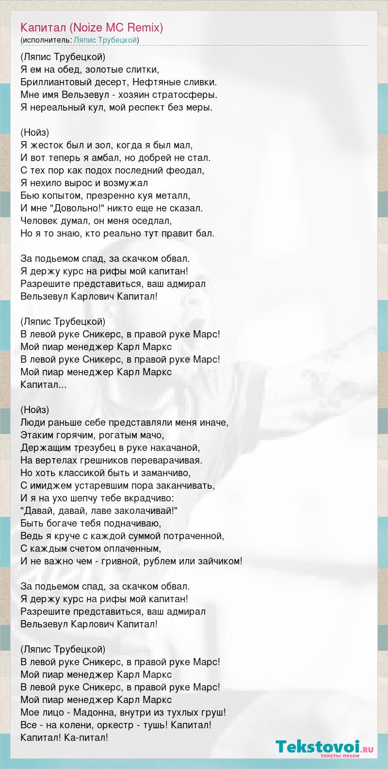 (Ляпис Трубецкой) Я ем на обед, золотые слитки, Бриллиантовый десерт, Нефтяные сливки. Мне имя Вельзевул - хозяин стратосферы. Я нереальный кул, мой респект без меры. (Нойз) Я жесток был и зол, когда я был мал, И вот теперь я амбал, но добрей не стал. С тех пор как подох последний феодал, Я нехило вырос и возмужал Бью копытом, презренно куя металл, И мне "Довольно!" никто еще не сказал. Человек думал, он меня оседлал, Но я то знаю, кто реально тут правит бал. За подьемом спад, за скачком обвал. Я держу курс на рифы мой капитан! Разрешите представиться, ваш адмирал Вельзевул Карлович Капитал! (Ляпис Трубецкой) В левой руке Сникерс, в правой руке Марс! Мой пиар менеджер Карл Маркс В левой руке Сникерс, в правой руке Марс! Мой пиар менеджер Карл Маркс Капитал... (Нойз) Люди раньше себе представляли меня иначе, Этаким горячим, рогатым мачо, Держащим трезубец в руке накачаной, На вертелах грешников переварачивая. Но хоть классикой быть и заманчиво, С имиджем устаревшим пора заканчивать, И я на ухо шепчу тебе вкрадчиво: "Давай, давай, лаве заколачивай!" Быть богаче тебя подначиваю, Ведь я круче с каждой суммой потраченной, С каждым счетом оплаченным, И не важно чем - гривной, рублем или зайчиком! За подьемом спад, за скачком обвал. Я держу курс на рифы мой капитан! Разрешите представиться, ваш адмирал Вельзевул Карлович Капитал! (Ляпис Трубецкой) В левой руке Сникерс, в правой руке Марс! Мой пиар менеджер Карл Маркс В левой руке Сникерс, в правой руке Марс! Мой пиар менеджер Карл Маркс Мое лицо - Мадонна, внутри из тухлых груш! Все - на колени, оркестр - тушь! Капитал! Капитал! Ка-питал!
