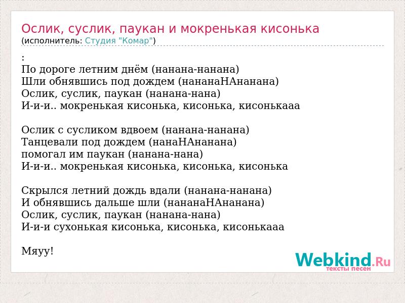 : По дороге летним днём (нанана-нанана) Шли обнявшись под дождем (нананаНАнанана) Ослик, суслик, паукан (нанана-нана) И-и-и.. мокренькая кисонька, кисонька, кисонькааа Ослик с сусликом вдвоем (нанана-нанана) Танцевали под дождем (нанаНАнанана) помогал им паукан (нанана-нана) И-и-и.. мокренькая кисонька, кисонька, кисонька Скрылся летний дождь вдали (нанана-нанана) И обнявшись дальше шли (нананаНАнанана) Ослик, суслик, паукан (нанана-нана) И-и-и сухонькая кисонька, кисонька, кисонькааа Мяуу!