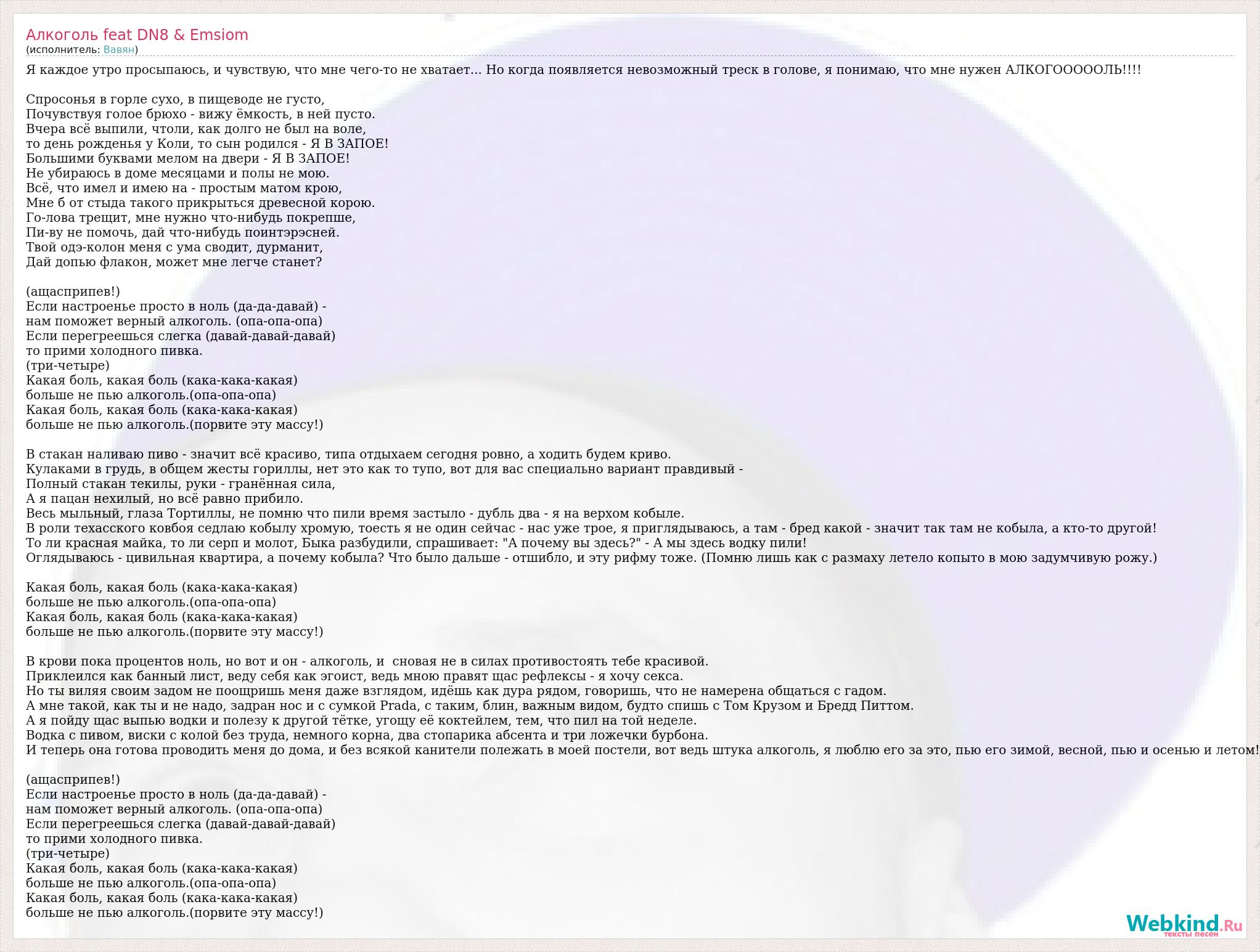 Я каждое утро просыпаюсь, и чувствую, что мне чего-то не хватает... Но когда появляется невозможный треск в голове, я понимаю, что мне нужен АЛКОГОООООЛЬ!!!! Спросонья в горле сухо, в пищеводе не густо, Почувствуя голое брюхо - вижу ёмкость, в ней пусто. Вчера всё выпили, чтоли, как долго не был на воле, то день рожденья у Коли, то сын родился - Я В ЗАПОЕ! Большими буквами мелом на двери - Я В ЗАПОЕ! Не убираюсь в доме месяцами и полы не мою. Всё, что имел и имею на - простым матом крою, Мне б от стыда такого прикрыться древесной корою. Го-лова трещит, мне нужно что-нибудь покрепше, Пи-ву не помочь, дай что-нибудь поинтэрэсней. Твой одэ-колон меня с ума сводит, дурманит, Дай допью флакон, может мне легче станет? (ащасприпев!) Если настроенье просто в ноль (да-да-давай) - нам поможет верный алкоголь. (опа-опа-опа) Если перегреешься слегка (давай-давай-давай) то прими холодного пивка. (три-четыре) Какая боль, какая боль (кака-кака-какая) больше не пью алкоголь.(опа-опа-опа) Какая боль, какая боль (кака-кака-какая) больше не пью алкоголь.(порвите эту массу!) В стакан наливаю пиво - значит всё красиво, типа отдыхаем сегодня ровно, а ходить будем криво. Кулаками в грудь, в общем жесты гориллы, нет это как то тупо, вот для вас специально вариант правдивый - Полный стакан текилы, руки - гранённая сила, А я пацан нехилый, но всё равно прибило. Весь мыльный, глаза Тортиллы, не помню что пили время застыло - дубль два - я на верхом кобыле. В роли техасского ковбоя седлаю кобылу хромую, тоесть я не один сейчас - нас уже трое, я приглядываюсь, а там - бред какой - значит так там не кобыла, а кто-то другой! То ли красная майка, то ли серп и молот, Быка разбудили, спрашивает: "А почему вы здесь?" - А мы здесь водку пили! Оглядываюсь - цивильная квартира, а почему кобыла? Что было дальше - отшибло, и эту рифму тоже. (Помню лишь как с размаху летело копыто в мою задумчивую рожу.) Какая боль, какая боль (кака-кака-какая) больше не пью алкоголь.(опа-опа-опа) Какая боль, какая боль (кака-кака-какая) больше не пью алкоголь.(порвите эту массу!) В крови пока процентов ноль, но вот и он - алкоголь, и сновая не в силах противостоять тебе красивой. Приклеился как банный лист, веду себя как эгоист, ведь мною правят щас рефлексы - я хочу секса. Но ты виляя своим задом не поощришь меня даже взглядом, идёшь как дура рядом, говоришь, что не намерена общаться с гадом. А мне такой, как ты и не надо, задран нос и с сумкой Prada, с таким, блин, важным видом, будто спишь с Том Крузом и Бредд Питтом. А я пойду щас выпью водки и полезу к другой тётке, угощу её коктейлем, тем, что пил на той неделе. Водка с пивом, виски с колой без труда, немного корна, два стопарика абсента и три ложечки бурбона. И теперь она готова проводить меня до дома, и без всякой канители полежать в моей постели, вот ведь штука алкоголь, я люблю его за это, пью его зимой, весной, пью и осенью и летом! (ащасприпев!) Если настроенье просто в ноль (да-да-давай) - нам поможет верный алкоголь. (опа-опа-опа) Если перегреешься слегка (давай-давай-давай) то прими холодного пивка. (три-четыре) Какая боль, какая боль (кака-кака-какая) больше не пью алкоголь.(опа-опа-опа) Какая боль, какая боль (кака-кака-какая) больше не пью алкоголь.(порвите эту массу!)