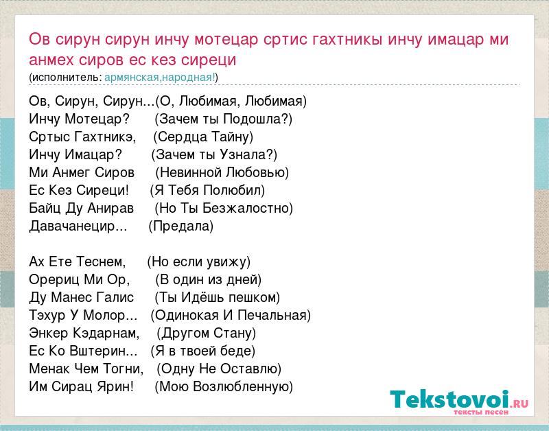 А как ты думаешь, о чем песня "Ов сирун сирун инчу мотецар сртис гахтникы инчу имацар ми анмех сиров ес кез с" ?