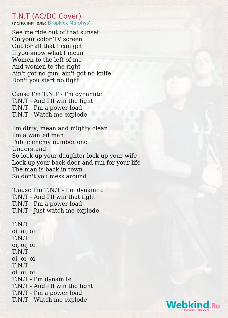 See me ride out of that sunset On your color TV screen Out for all that I can get If you know what I mean Women to the left of me And women to the right Ain't got no gun, ain't got no knife Don't you start no fight Cause I'm T.N.T - I'm dynamite T.N.T - And I'll win the fight T.N.T - I'm a power load T.N.T - Watch me explode I'm dirty, mean and mighty clean I'm a wanted man Public enemy number one Understand So lock up your daughter lock up your wife Lock up your back door and run for your life The man is back in town So don't you mess around 'Cause I'm T.N.T - I'm dynamite T.N.T - And I'll win that fight T.N.T - I'm a power load T.N.T - Just watch me explode T.N.T oi, oi, oi T.N.T oi, oi, oi T.N.T oi, oi, oi T.N.T oi, oi, oi T.N.T - I'm dynamite T.N.T - And I'll win the fight T.N.T - I'm a power load T.N.T - Watch me explode