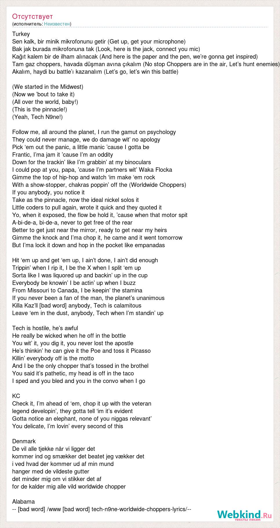 Turkey Sen kalk, bir minik mikrofonunu getir (Get up, get your microphone) Bak jak burada mikrofonuna tak (Look, here is the jack, connect you mic) Kağıt kalem bir de ilham alınacak (And here is the paper and the pen, we’re gonna get inspired) Tam gaz choppers, havada düşman avına çıkalım (No stop Choppers are in the air, Let’s hunt enemies) Akalım, haydi bu battle’ı kazanalım (Let’s go, let’s win this battle) (We started in the Midwest) (Now we ’bout to take it) (All over the world, baby!) (This is the pinnacle!) (Yeah, Tech N9ne!) Follow me, all around the planet, I run the gamut on psychology They could never manage, we do damage wit’ no apology Pick ‘em out the panic, a little manic ’cause I gotta be Frantic, I’ma jam it ’cause I’m an oddity Down for the trackin’ like I’m grabbin’ at my binoculars I could pop at you, papa, ’cause I’m partners wit’ Waka Flocka Gimme the top of hip-hop and watch ‘im make ‘em rock With a show-stopper, chakras poppin’ off the (Worldwide Choppers) If you anybody, you notice it Take as the pinnacle, now the ideal nickel solos it Little coders to pull again, wrote it quick and they quoted it Yo, when it exposed, the flow be hold it, ’cause when that motor spit A-bi-de-a, bi-de-a, never to get free of the rear Better to get just near the mirror, ready to get near my heirs Gimme the knock and I’ma chop it, he came and it went tomorrow But I’ma lock it down and hop in the pocket like empanadas Hit ‘em up and get ‘em up, I ain’t done, I ain’t did enough Trippin’ when I rip it, I be the X when I split ‘em up Sorta like I was liquored up and backin’ up in the cup Everybody be knowin’ I be actin’ up when I buzz From Missouri to Canada, I be keepin’ the stamina If you never been a fan of the man, the planet’s unanimous Killa Kaz’ll [bad word] anybody, Tech is calamitous Leave ‘em in the dust, anybody, Tech when I’m standin’ up Tech is hostile, he’s awful He really be wicked when he off in the bottle You wit’ it, you dig it, you never lost the apostle He’s thinkin’ he can give it the Poe and toss it Picasso Killin’ everybody off is the motto And I be the only chopper that’s tossed in the brothel You said it’s pathetic, my head is off in the taco I sped and you bled and you in the convo when I go KC Check it, I’m ahead of ‘em, chop it up with the veteran legend developin’, they gotta tell ‘im it’s evident Gotta notice an elephant, none of you niggas relevant’ You delicate, I’m lovin’ every second of this Denmark De vil alle tjekke når vi ligger det kommer ind og smækker det beatet jeg vækker det i ved hvad der kommer ud af min mund hanger med de vildeste gutter det minder mig om vi stikker det af for de kalder mig alle vild worldwide chopper Alabama -- [bad word] /www [bad word] tech-n9ne-worldwide-choppers-lyrics/--
