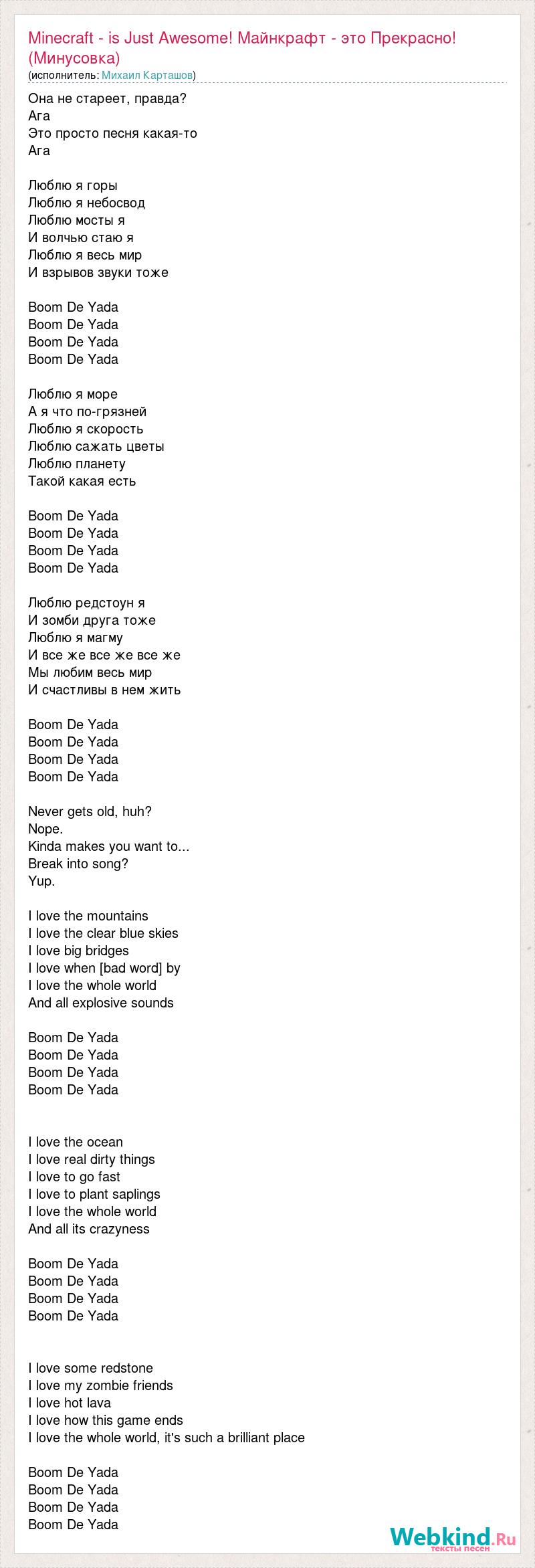 Она не стареет, правда? Ага Это просто песня какая-то Ага Люблю я горы Люблю я небосвод Люблю мосты я И волчью стаю я Люблю я весь мир И взрывов звуки тоже Boom De Yada Boom De Yada Boom De Yada Boom De Yada Люблю я море А я что по-грязней Люблю я скорость Люблю сажать цветы Люблю планету Такой какая есть Boom De Yada Boom De Yada Boom De Yada Boom De Yada Люблю редстоун я И зомби друга тоже Люблю я магму И все же все же все же Мы любим весь мир И счастливы в нем жить Boom De Yada Boom De Yada Boom De Yada Boom De Yada Never gets old, huh? Nope. Kinda makes you want to... Break into song? Yup. I love the mountains I love the clear blue skies I love big bridges I love when [bad word] by I love the whole world And all explosive sounds Boom De Yada Boom De Yada Boom De Yada Boom De Yada I love the ocean I love real dirty things I love to go fast I love to plant saplings I love the whole world And all its crazyness Boom De Yada Boom De Yada Boom De Yada Boom De Yada I love some redstone I love my zombie friends I love hot lava I love how this game ends I love the whole world, it's such a brilliant place Boom De Yada Boom De Yada Boom De Yada Boom De Yada