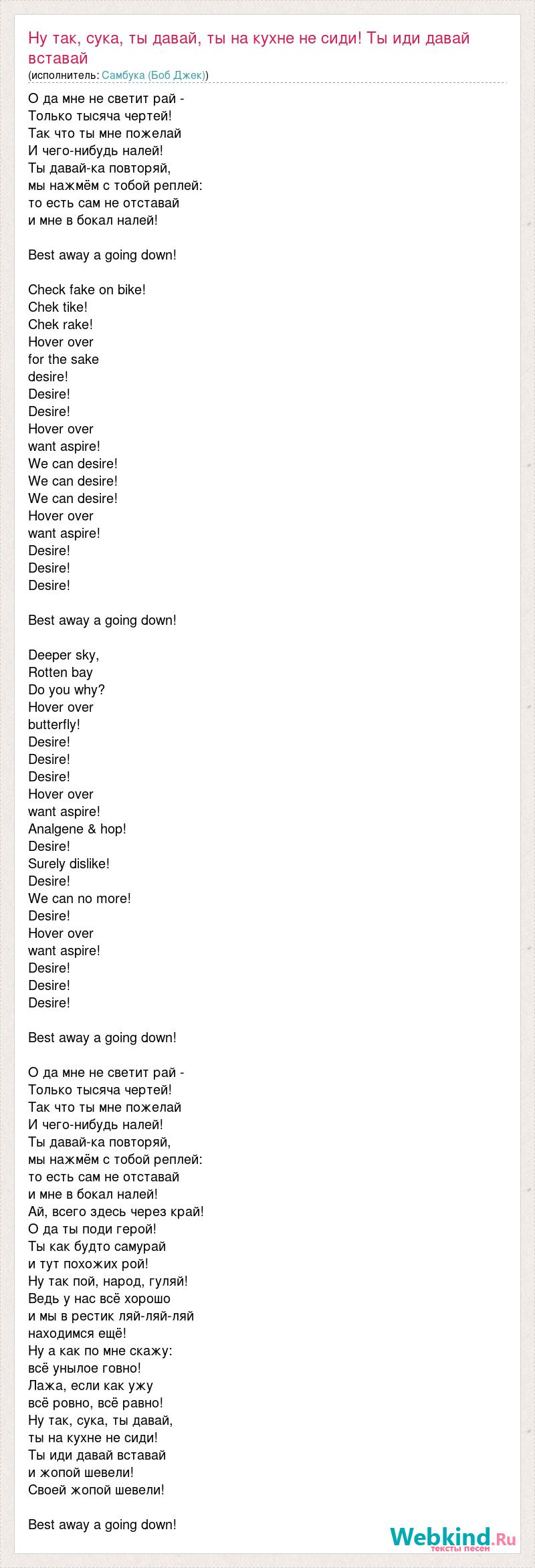 О да мне не светит рай - Только тысяча чертей! Так что ты мне пожелай И чего-нибудь налей! Ты давай-ка повторяй, мы нажмём с тобой реплей: то есть сам не отставай и мне в бокал налей! Best away a going down! Check fake on bike! Chek tike! Chek rake! Hover over for the sake desire! Desire! Desire! Hover over want aspire! We can desire! We can desire! We can desire! Hover over want aspire! Desire! Desire! Desire! Best away a going down! Deeper sky, Rotten bay Do you why? Hover over butterfly! Desire! Desire! Desire! Hover over want aspire! Analgene & hop! Desire! Surely dislike! Desire! We can no more! Desire! Hover over want aspire! Desire! Desire! Desire! Best away a going down! О да мне не светит рай - Только тысяча чертей! Так что ты мне пожелай И чего-нибудь налей! Ты давай-ка повторяй, мы нажмём с тобой реплей: то есть сам не отставай и мне в бокал налей! Ай, всего здесь через край! О да ты поди герой! Ты как будто самурай и тут похожих рой! Ну так пой, народ, гуляй! Ведь у нас всё хорошо и мы в рестик ляй-ляй-ляй находимся ещё! Ну а как по мне скажу: всё унылое говно! Лажа, если как ужу всё ровно, всё равно! Ну так, сука, ты давай, ты на кухне не сиди! Ты иди давай вставай и жопой шевели! Своей жопой шевели! Best away a going down!