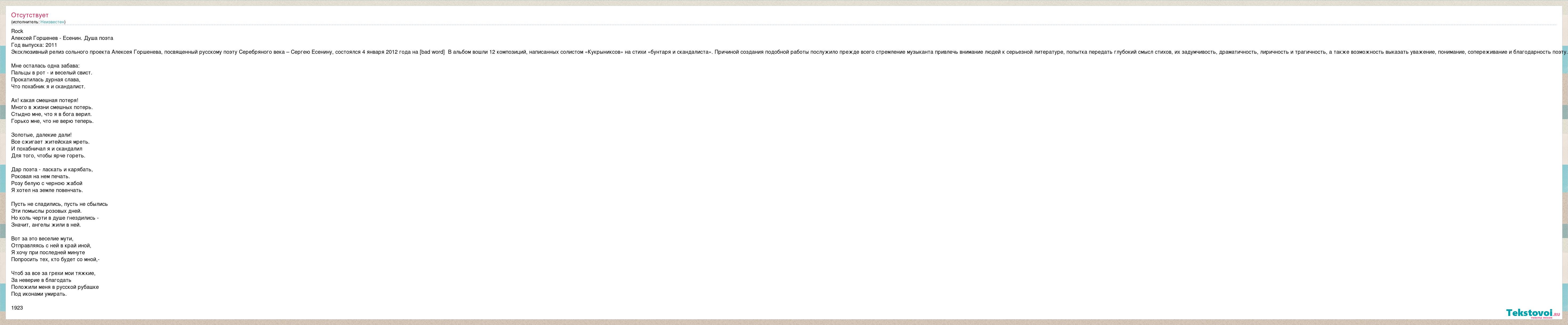 Rock Алексей Горшенев - Есенин. Душа поэта Год выпуска: 2011 Эксклюзивный релиз сольного проекта Алексея Горшенева, посвященный русскому поэту Серебряного века – Сергею Есенину, состоялся 4 января 2012 года на [bad word] В альбом вошли 12 композиций, написанных солистом «Кукрыниксов» на стихи «бунтаря и скандалиста». Причиной создания подобной работы послужило прежде всего стремление музыканта привлечь внимание людей к серьезной литературе, попытка передать глубокий смысл стихов, их задумчивость, драматичность, лиричность и трагичность, а также возможность выказать уважение, понимание, сопереживание и благодарность поэту. Мне осталась одна забава: Пальцы в рот - и веселый свист. Прокатилась дурная слава, Что похабник я и скандалист. Ах! какая смешная потеря! Много в жизни смешных потерь. Стыдно мне, что я в бога верил. Горько мне, что не верю теперь. Золотые, далекие дали! Все сжигает житейская мреть. И похабничал я и скандалил Для того, чтобы ярче гореть. Дар поэта - ласкать и карябать, Роковая на нем печать. Розу белую с черною жабой Я хотел на земле повенчать. Пусть не сладились, пусть не сбылись Эти помыслы розовых дней. Но коль черти в душе гнездились - Значит, ангелы жили в ней. Вот за это веселие мути, Отправляясь с ней в край иной, Я хочу при последней минуте Попросить тех, кто будет со мной,- Чтоб за все за грехи мои тяжкие, За неверие в благодать Положили меня в русской рубашке Под иконами умирать. 1923
